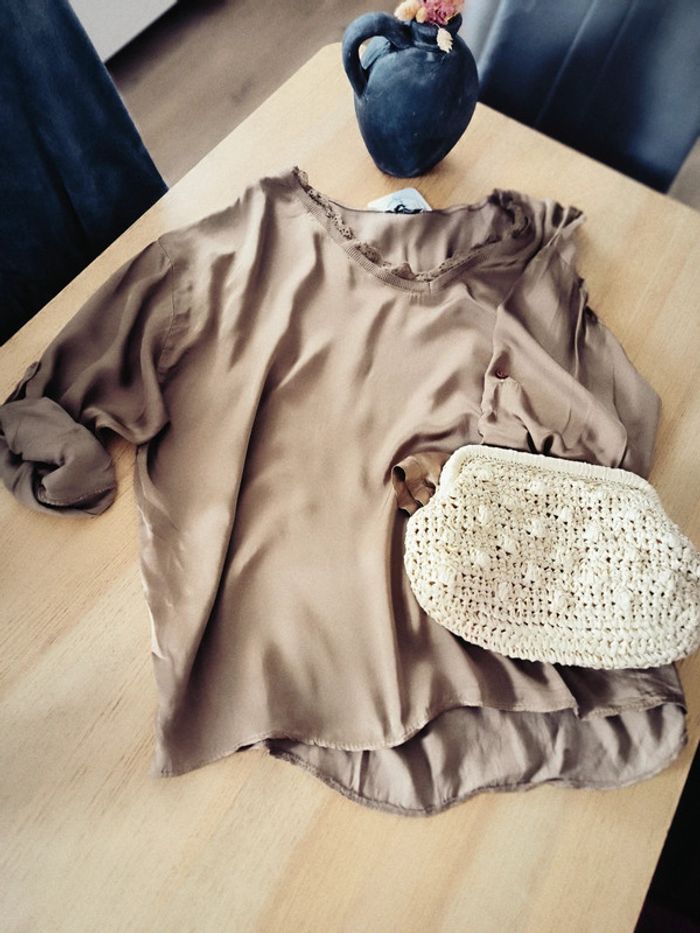 Magnifique blouse col v dentelle Manche retroussable Largeur aisselles 70 cm Longueur 72 cm Taille unique #blousesoie #blouseboheme #blousebohemechic