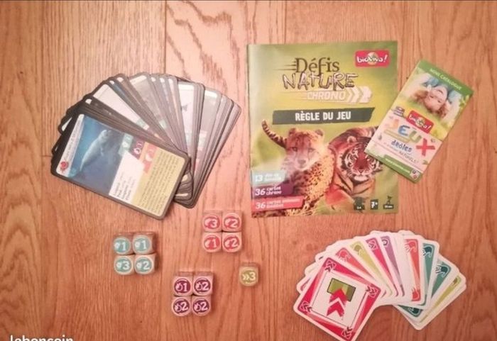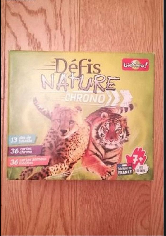 Vends jeu Défis Nature chrono composé de : - 13 dés de bataille - 36 cartes chrono - 36 cartes animaux inédits - Une règle du jeu But du jeu : 1- Aiguise tes réflexes avec les cartes chrono pour obtenir le dé bonus 2- Choisis un animal suivant sa force, sa rapidité et sa capacité de camouflage 3- Joue avec tes dés de bataille pour mener ton animal à la victoire 4- En cas d'égalité, mise sur les caractéristiques de ton animal Piur remporter la manche ! Soyez le plus rapide pour l’emporter dans l’épreuve « Chrono », puis défiez les autres joueurs grâce aux nouveaux dés de force, vitesse et camouflage. Saurez-vous mener vos animaux à la victoire et tenir le rythme de « Défis Nature Chrono » ? Le + produit : un nouveau format de boîte, facile à emporter partout. De 2 à 4 joueurs. Dès 7 ans. Environ 20 minutes de jeu. Prix de vente : 17 € À récupérer à Boulogne-Billancourt. Envoi possible (frais à la charge de l'acheteur).