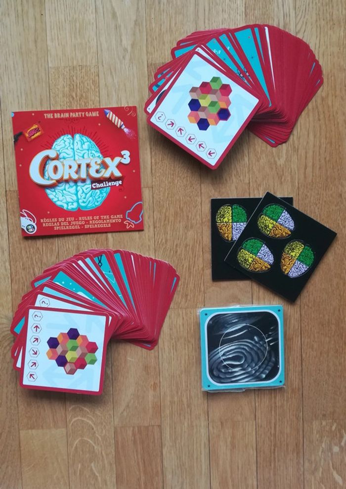 Vends jeu Cortex 3 challenge Contenu : - 90 cartes (dont 10 cartes olfactives), - 6 cerveaux-puzzles - Un livret de règles. Règles du jeu : Découvrez 8 challenges différents mettant à l’épreuve le sens de l’observation, la mémoire, la coordination et la logique des joueurs. Cette version comprend 10 cartes olfactives venant remplacer les cartes tactiles des autres jeux de la gamme. Saurez-vous reconnaître à quoi correspond l’odeur de chaque carte? Après les cartes tactiles des anciennes versions du jeu pour tester son sens du toucher, les cartes olfactives viendront titiller votre odorat. Alors, prêts à relever le challenge? Prix de vente : 14 € À récupérer à Boulogne Billancourt (et ses environs : Paris...). Envoi possible.