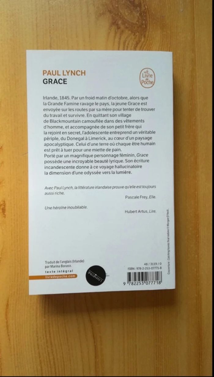 Vends livre "Grace" de Paul Lynch Je vends également d'autres livres pour adultes : #livresV92B Prix de vente : 6,20 € À récupérer à Boulogne-Billancourt (et ses environs : Paris...). Envoi possible.