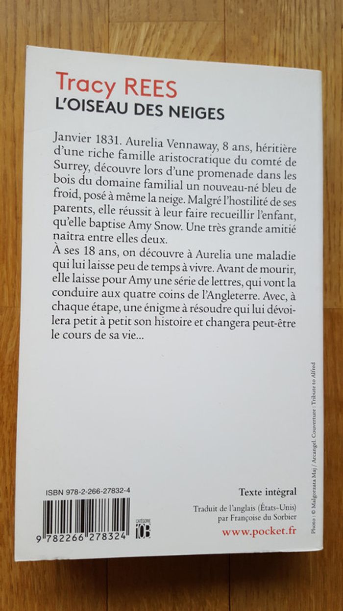 Vends livre « L’oiseau des neiges » de Tracy REES. #livresV92B Collection POCKET Résumé : Janvier 1831. Aurelia Vennaway, huit ans, héritière d'une riche famille aristocratique du comté de Surrey, découvre lors d'une promenade dans les bois du domaine familial un nouveau-né bleu de froid, posé à même la neige. Malgré l'hostilité de ses parents, elle réussit à leur faire recueillir l'enfant, qu'elle baptise Amy Snow. A ses dix-huit ans, on découvre à Aurelia une maladie qui lui laisse peu de temps à vivre. Elle décide donc de partir en voyage quelques mois. Avant de mourir, elle laisse pour Amy une série de lettres qui vont l'aider à découvrir qui elle est et lui transmettre l'héritage qui lui revient. Amy s'embarque alors pour un périple aux quatre coins de l'Angleterre, avec, à chaque étape, une énigme à résoudre. Prix de vente : 7 € À récupérer à Boulogne-Billancourt (et ses environs : Paris...). Envoi possible.