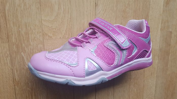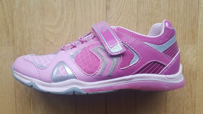 A vendre baskets modèle fille - marque GEOX Sport Taille 33 – Couleur rose Fermeture facile par bande auto-agrippante ajustable (scratch) Composition : . Tige cuir / textile . Doublure textile . Renforts en cuir . Semelle intérieure : cuir Etat neuf