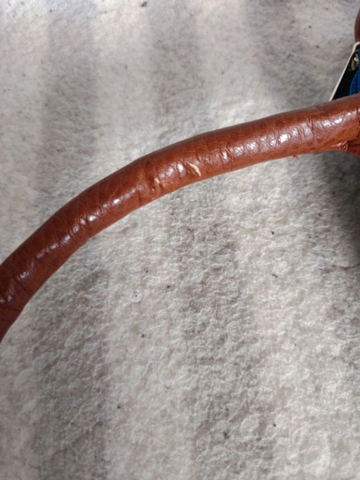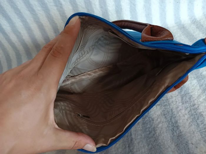 Sac à main bleu et marron Longueur : 36 cm Hauteur : 19,5cm Largeur : 12,5cm Un petit accroc sur la anse, voir dernière photo
