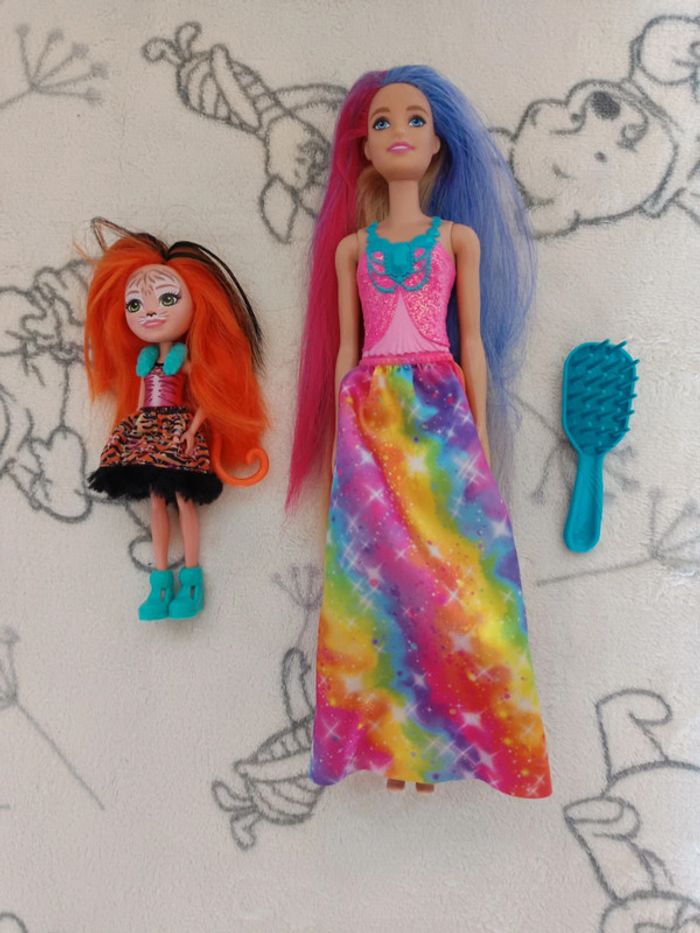 Lot de 2 poupées, 1 Barbie et 1 Enchantimals + 1 brosse