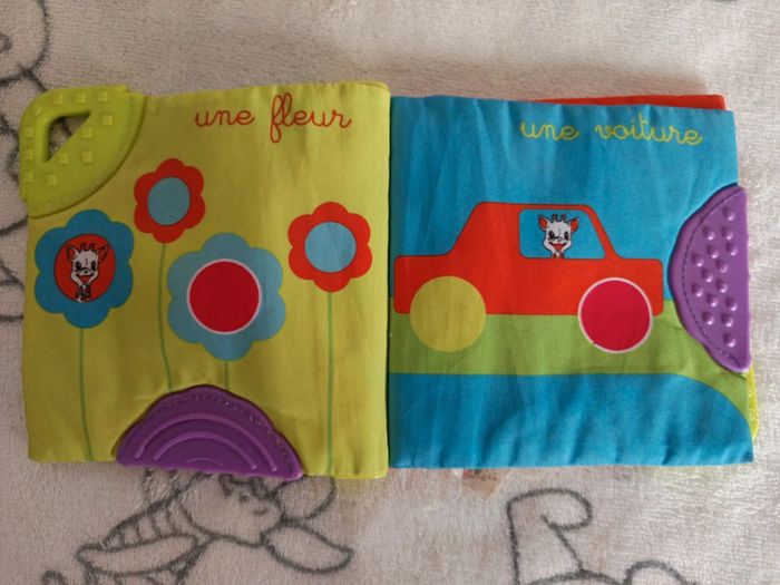 Livre de dentition Sophie la Girafe Dans la 1 ère page il y a un pouet et la 3 ème page fait du bruit. Quelques petites tâches, à nettoyer