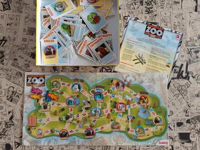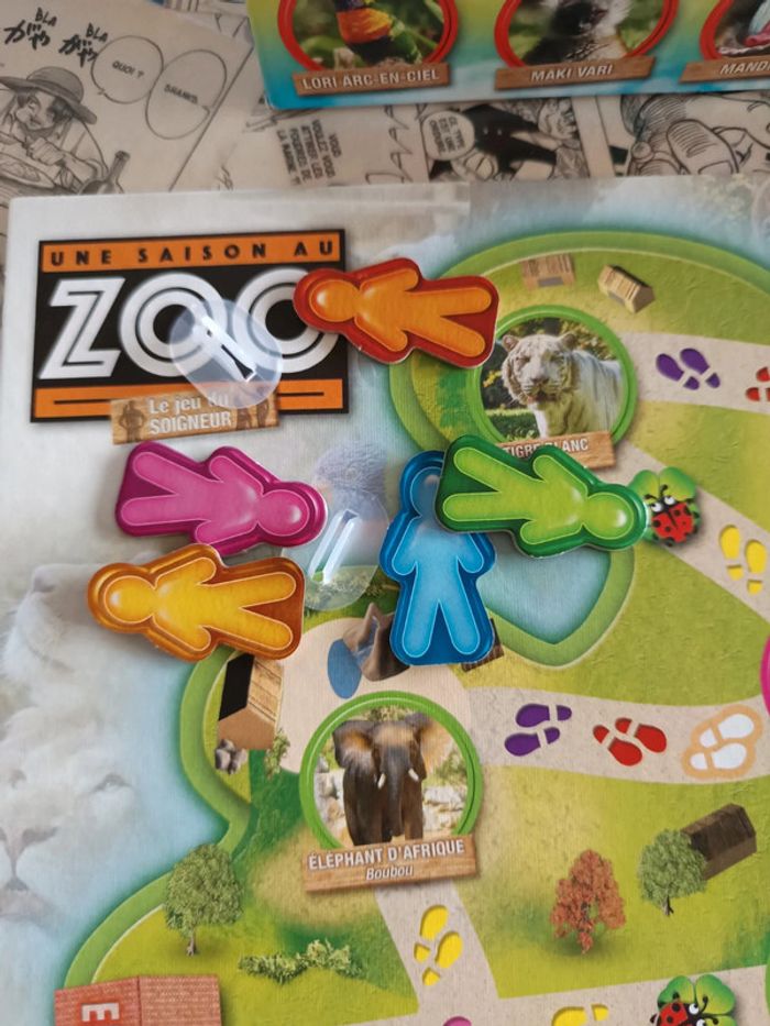 Jeu de société Une saison au zoo Manque 1 pion et 4 support pion (peuvent être remplacé par d'autres pions) Le couvercle de la boîte est un peu abîmée