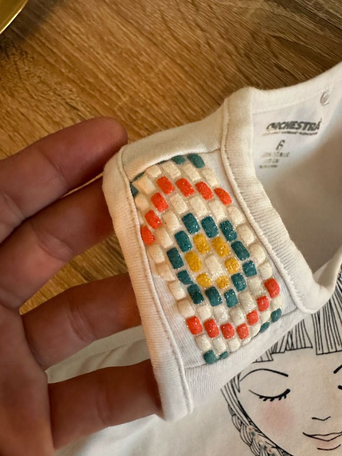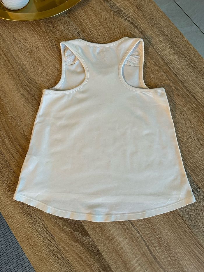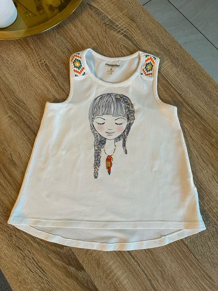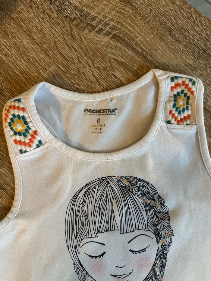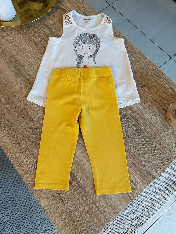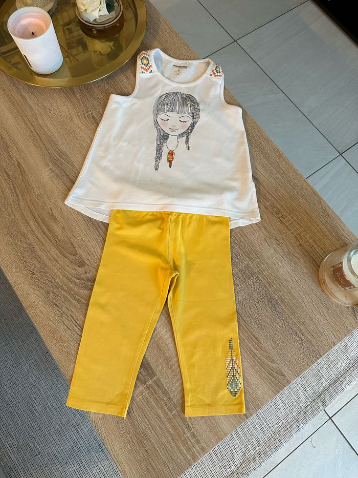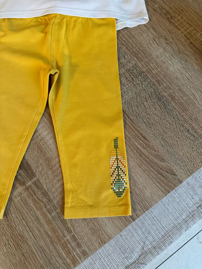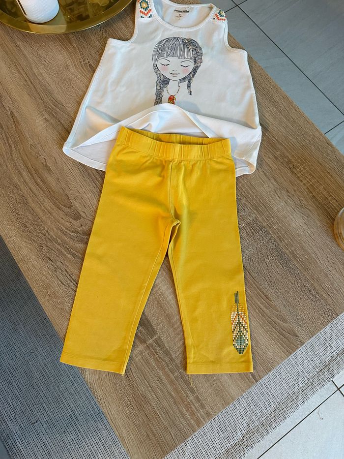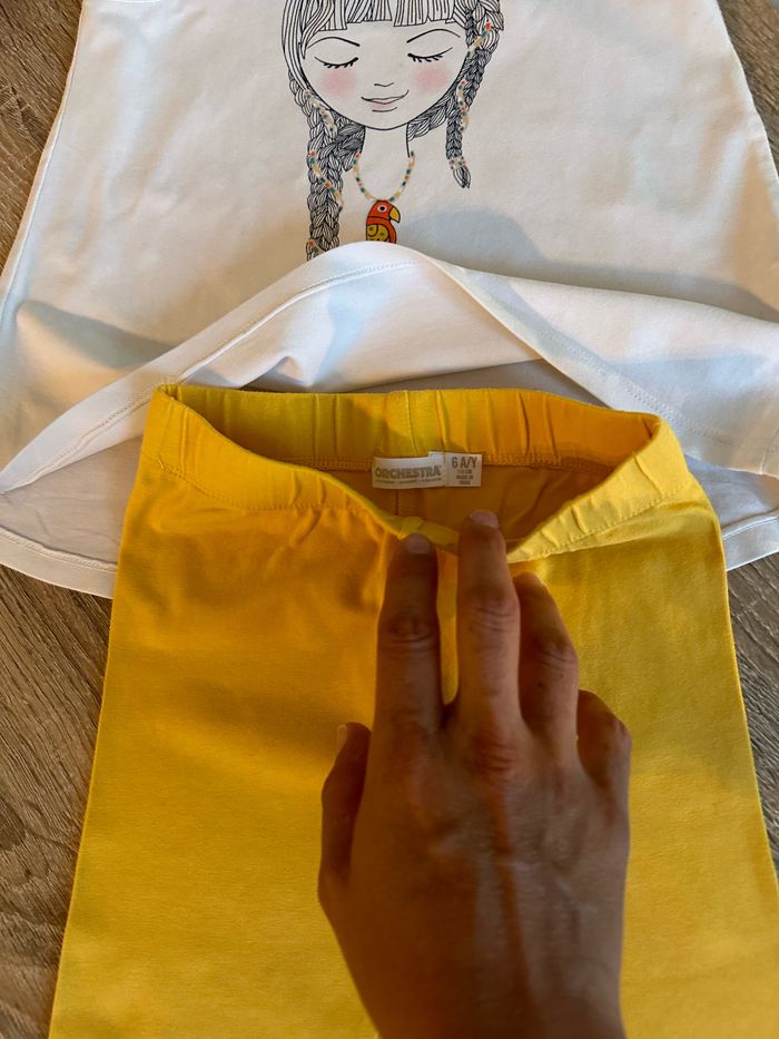 Ensemble débardeur et legging 3/4 , haut blanc avec motif imprimé sur le devant ainsi que sur les épaules Legging jaune moutarde avec motif imprimé sur le bas de jambe gauche , élastique intégré à la taille Taille 6 ans. Orchestra. Seconde main en très bon état