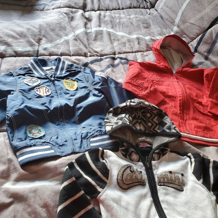 1 veste déperlante doublé coton ikks très bon état 1 gilet catimini présense de bouloches sinon bon état 1 veste catimini entièrement en coton état neuf idéal printemps été