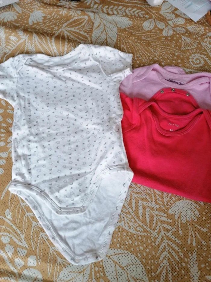 Lot de 3 body Le blanc à motif n'a pas de défaut Les deux autres ont 2 petites taches et ont été + portés, d'où le prix ! Ils peuvent cependant largement servir encore. 1 euro les 3. #bébéfille18moisetoile67100