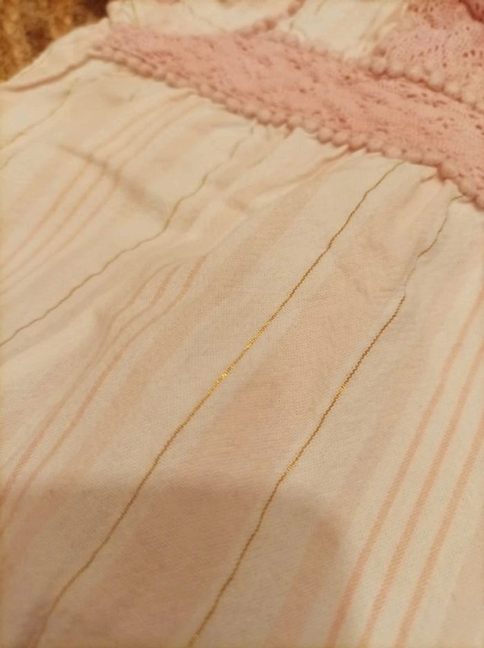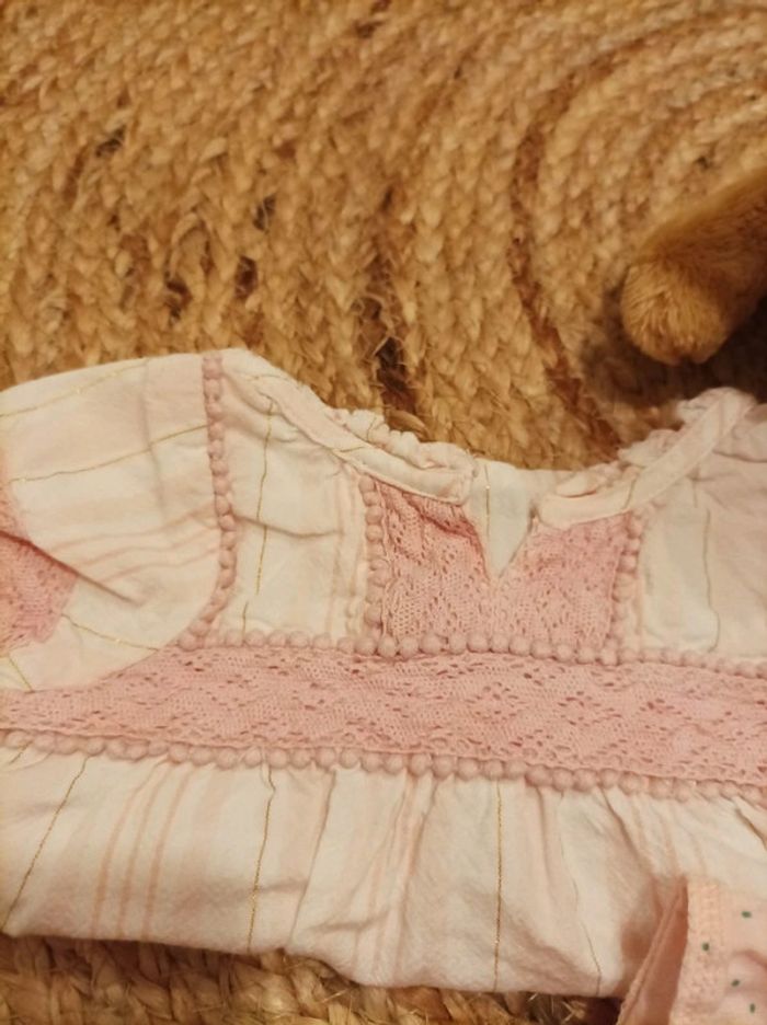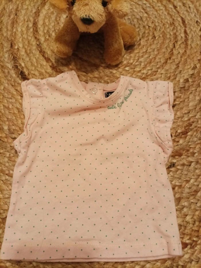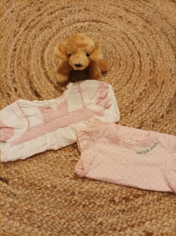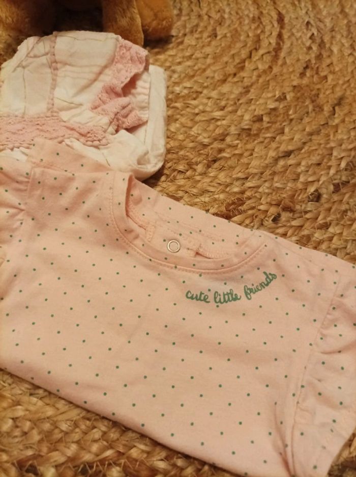 2 hauts manches courtes L'un à pois L'autre à rayure avec des fils dorés Très bon état #bébéfille3moisetoile67100 #bebefille3mois