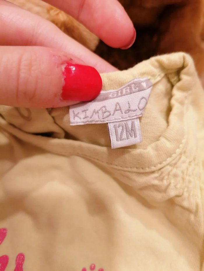 Lot de 2 t shirt Le premier avec une inscription en TBE Marque Kimbaloo Le second est un t shirt simple, uni en 100 % coton. Details boutons sur les épaules #bébéfille12moisetoile67100 #bebefille12mois
