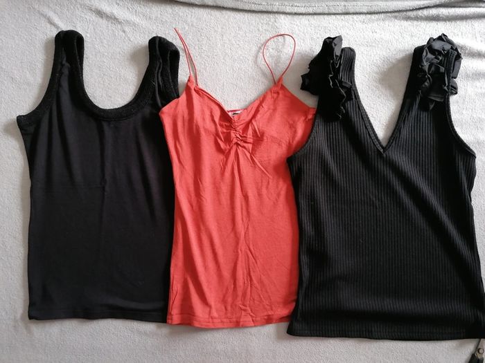 Lot de débardeur taille S Le noir a froufrou est noté L mais ce n'est pas du tout le cas. Celui du milieu est vendu, prix revu en conséquence. Marque diverses Celui du milieu à été porté 1 fois. Ils sont en très bon état #Femme36etoile67100