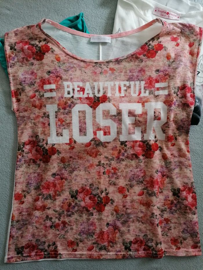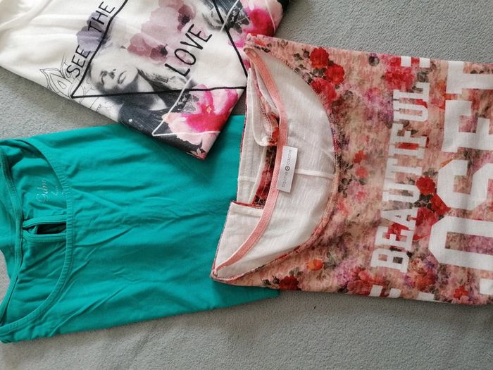 Lot de 2 t shirt colorés (en haut à droite a été vendu) Taille 34 Très bon état Le fleuri est celui qui a été le + porté Mais sur l'ensemble aucun trous ni tâches D'autres lots taille 34 visible sur mon Dressing, également taille 36 ou 38...réductions actives sur les lots #Femme34etoile67100