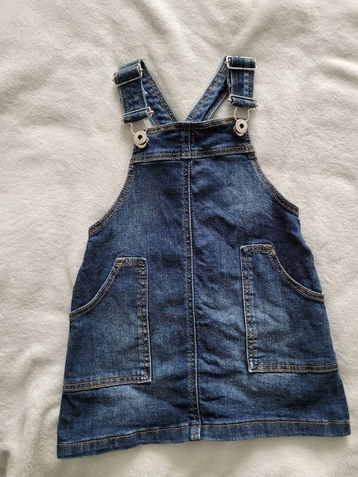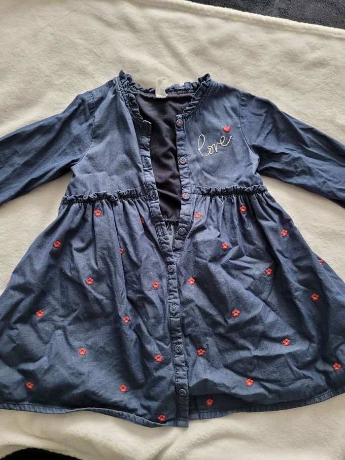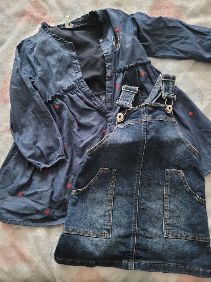 Lot de 2 robes jean ou imitation jean des marques orchestra (fleurs rouge), tex (salopette). TBE. La salopette n'a jamais été portée juste lavé. 24mois
