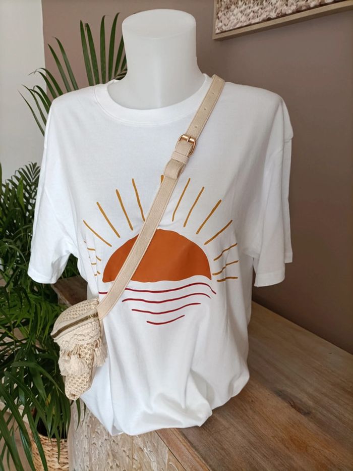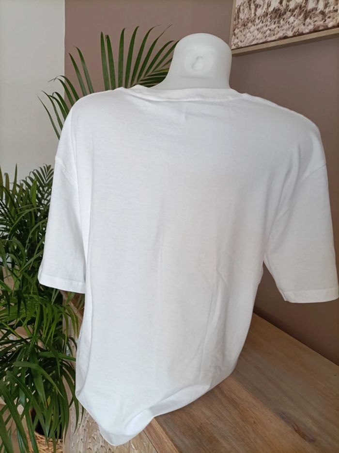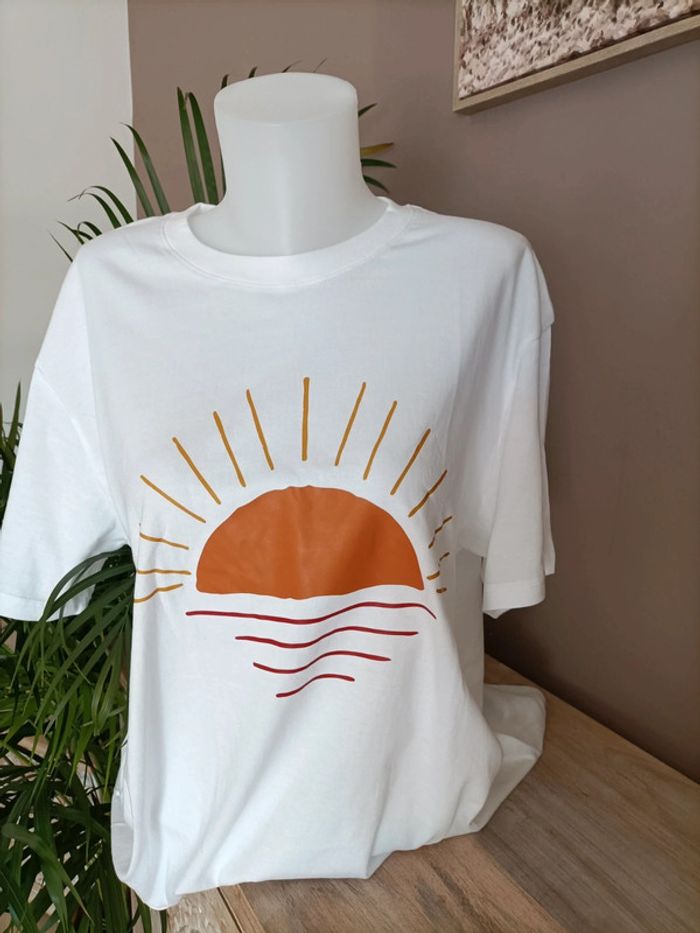 T-shirt blanc Soleil ☀️ Taille M légèrement Oversized Neuf, jamais porté Emballage soigné et livraison rapide 📦✅ N'hésitez pas à me contacter pour plus d'informations ou d'autres photos 😀