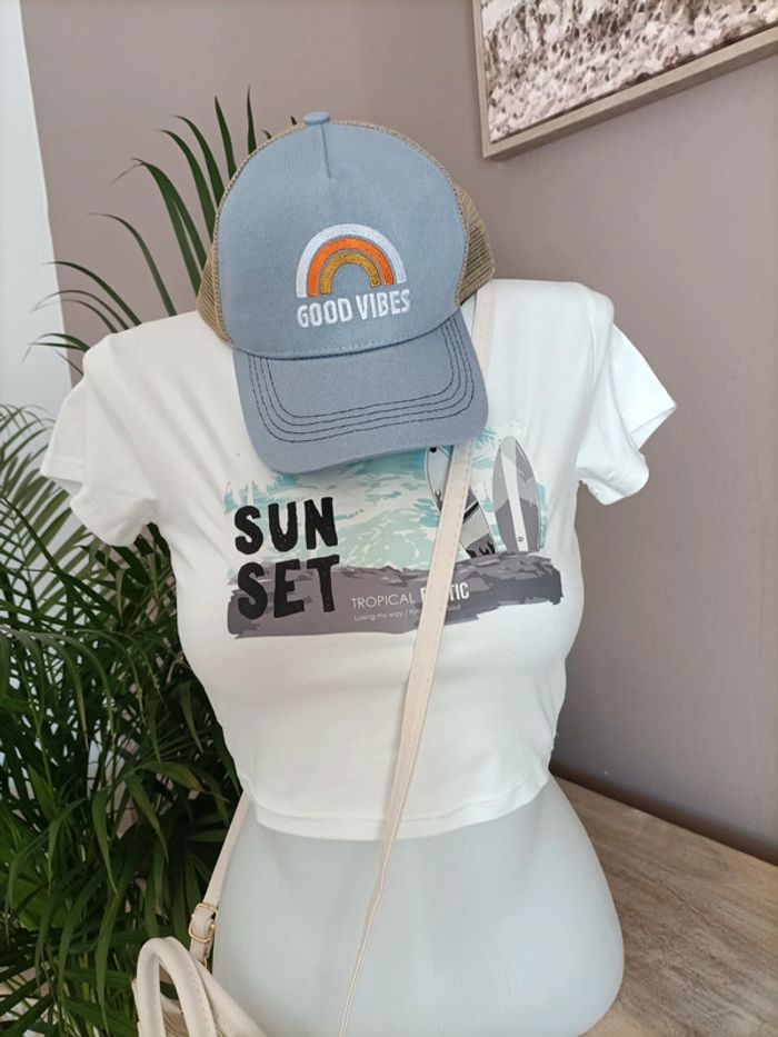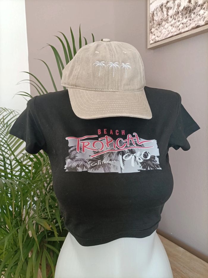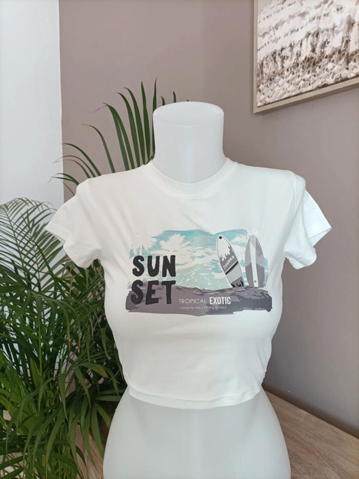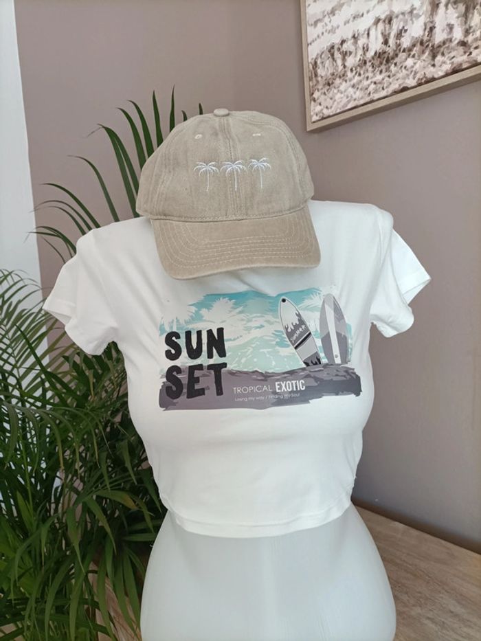 Lot de 2 T-shirts Crops Top noir et blanc imprimé Sunset Tropical ☀️🏝️ Taille S / Neufs, jamais portés Propre et repassé lors de l'envoi 🌿 Emballage soigné et livraison rapide 📦✅ N'hésitez pas à me contacter pour plus d'informations ou d'autres photos 😀