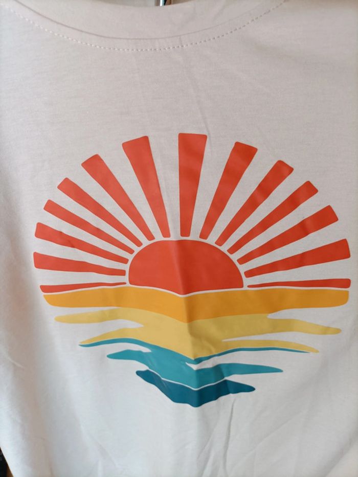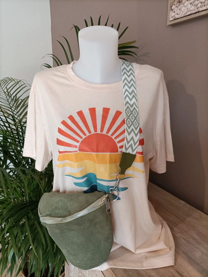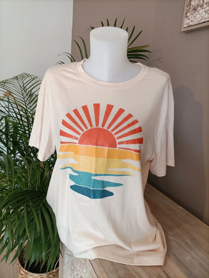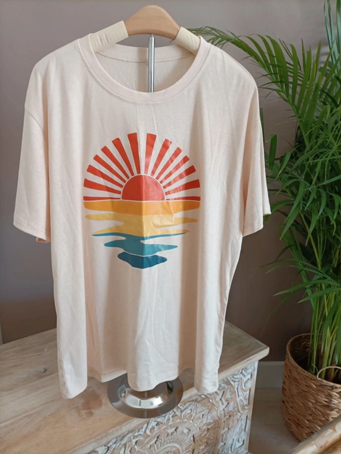 T-shirt couleur beige saumon clair avec imprimé Coucher du soleil 🌅 Taille L/XL (style Oversized) Neuf, jamais porté Le t-shirt est propre et repassé lors de l'envoi 🌿 Emballage soigné et livraison rapide 📦✅ N'hésitez pas à me contacter pour plus d'informations ou d'autres photos 😀