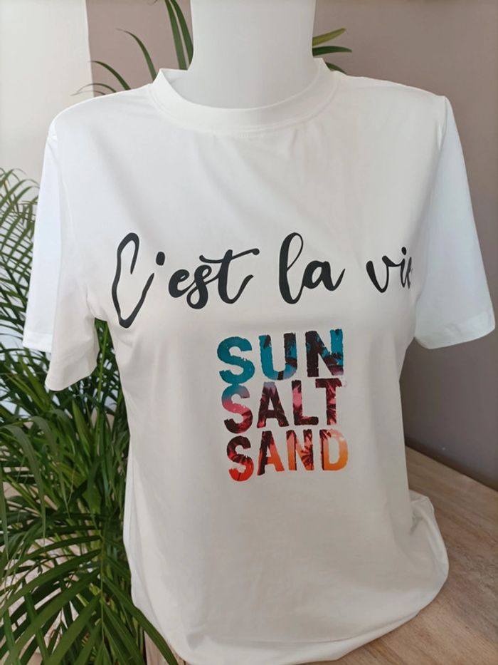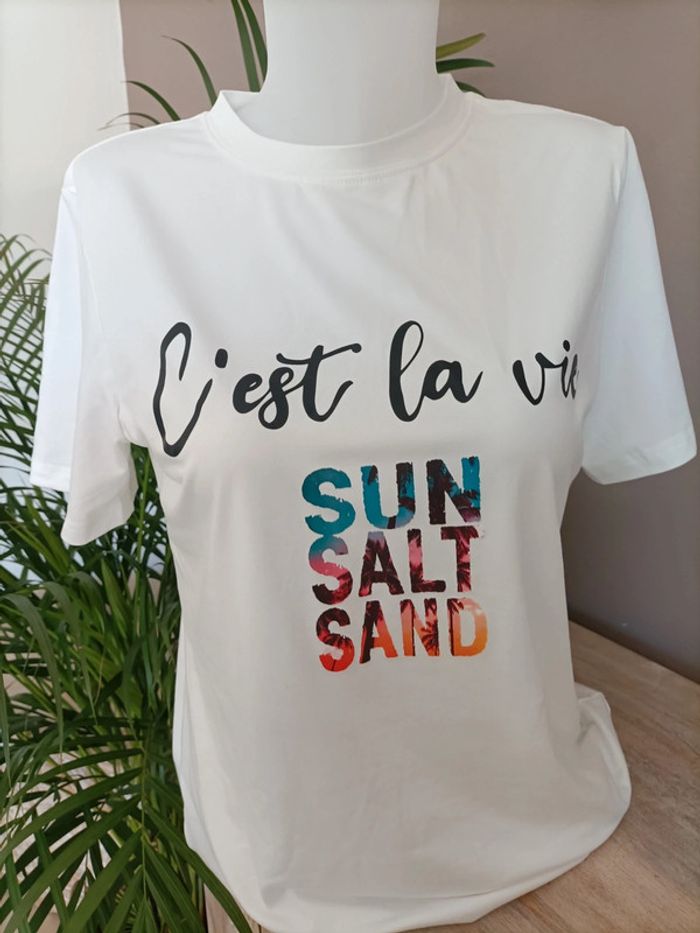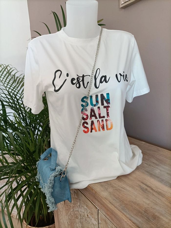 T-shirt blanc avec imprimé C'est la vie ☀️ Taille M / Neuf, jamais porté Emballage soigné et livraison rapide 📦✅ N'hésitez pas à me contacter pour plus d'informations ou d'autres photos 😀