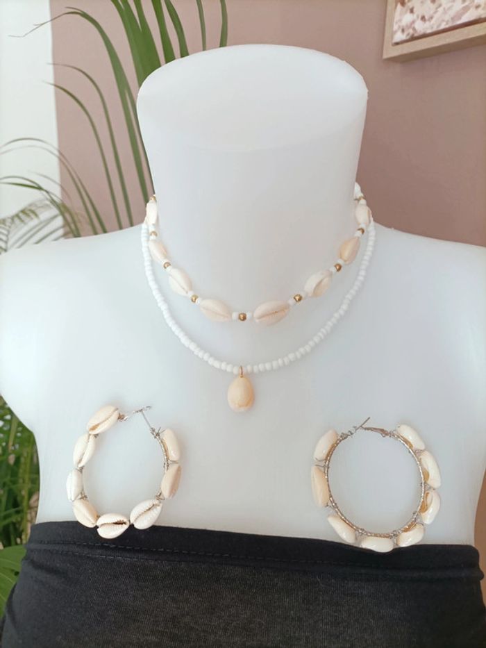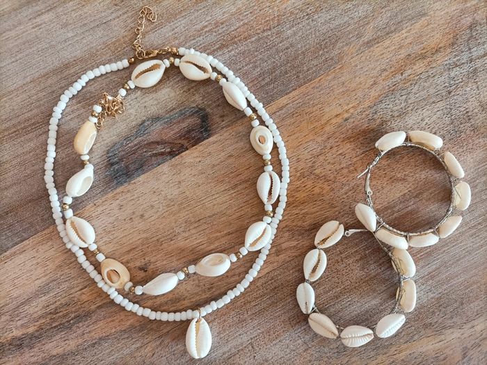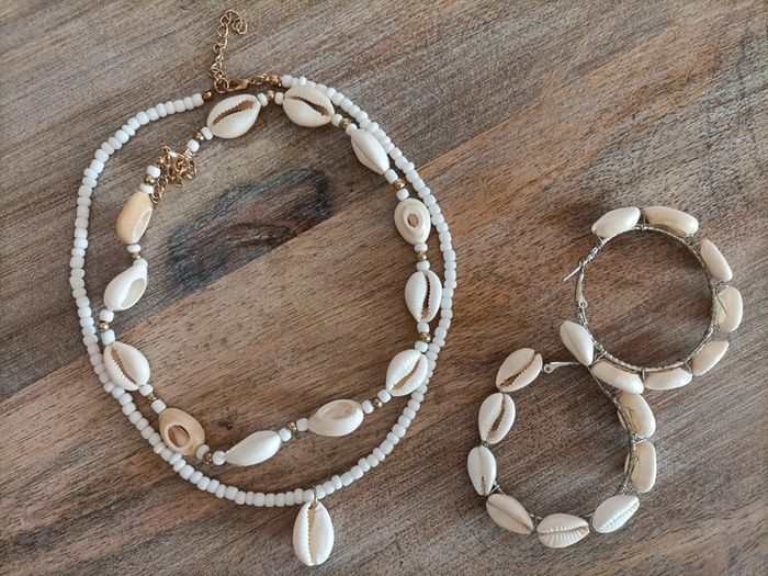 Ensemble de bijoux Coquillages ☀️ 2 colliers dont 1 Ras-de-cou Boucles d'oreilles créoles Neuf, jamais porté Emballage soigné et livraison rapide 📦✅ N'hésitez pas à me contacter pour plus d'informations ou d'autres photos 😀
