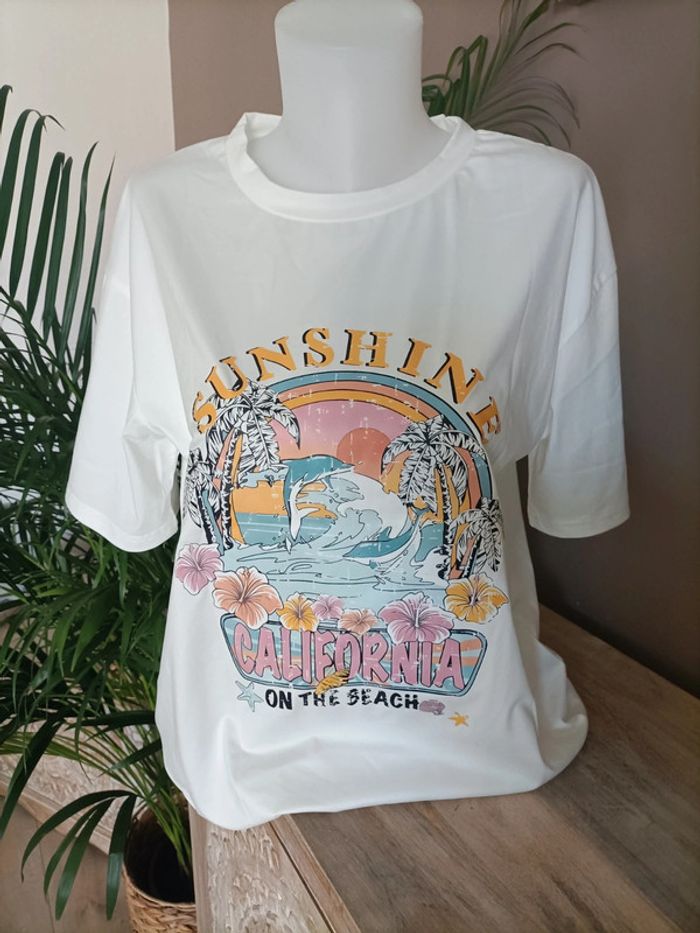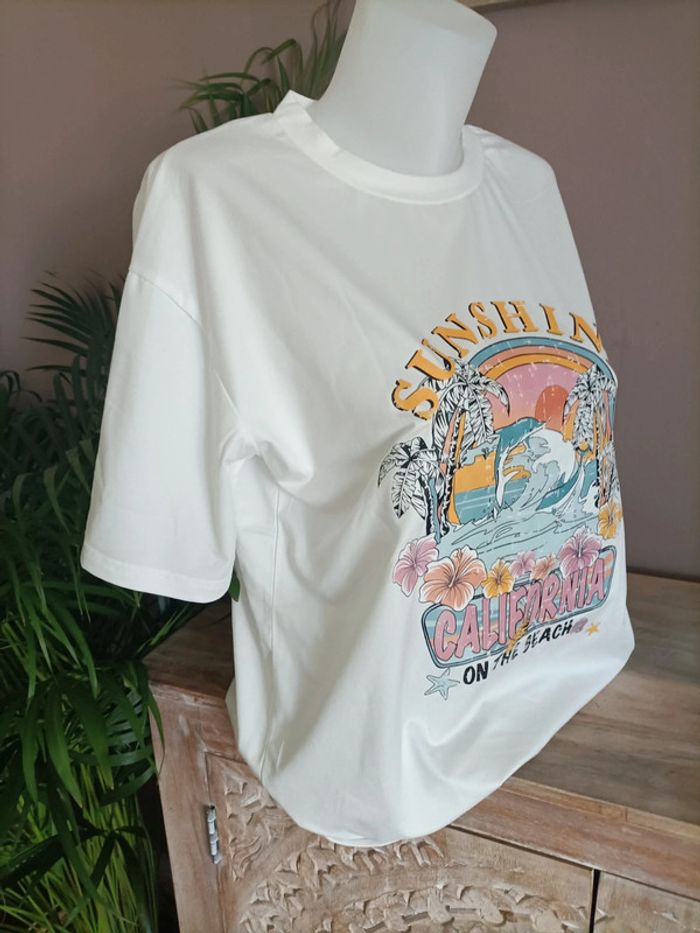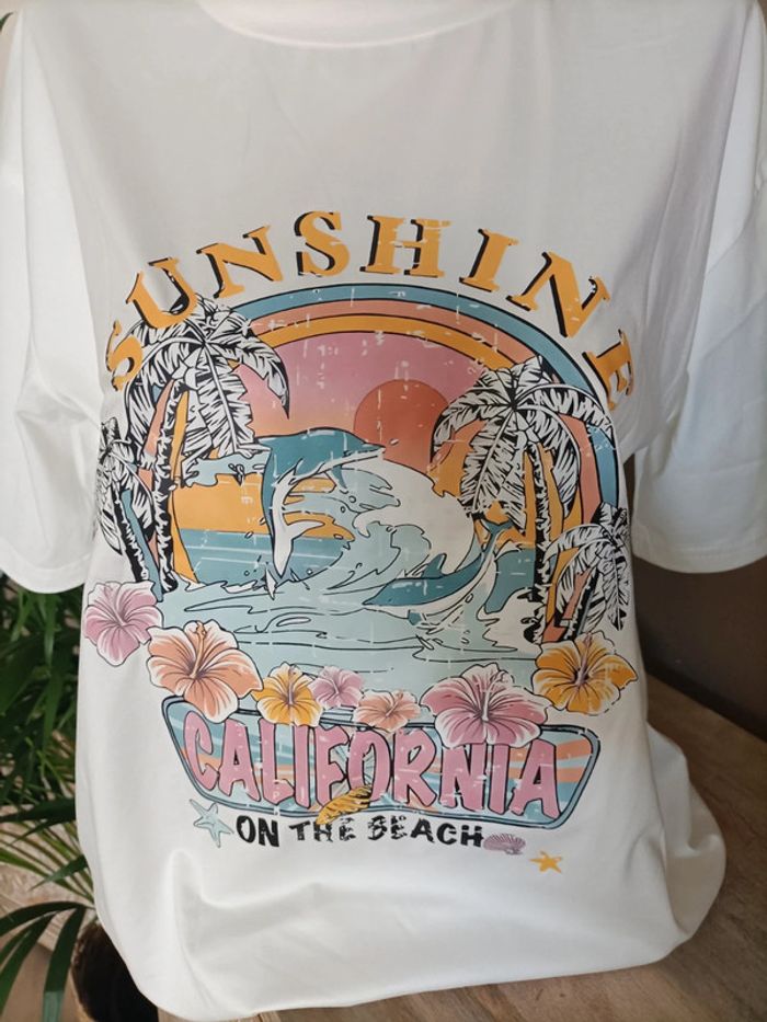 T-shirt blanc Soleil California multi couleurs pastel ☀️🌈 Taille M légèrement Oversized Neuf, jamais porté Emballage soigné et livraison rapide 📦✅ N'hésitez pas à me contacter pour plus d'informations ou d'autres photos 😀