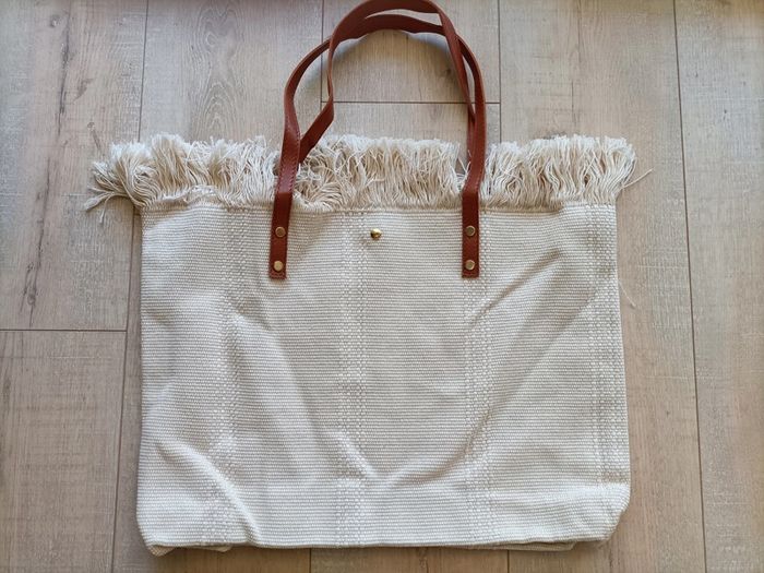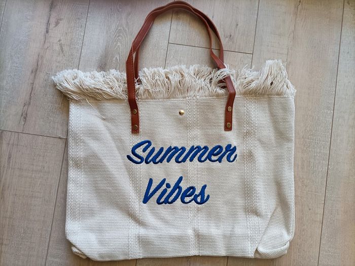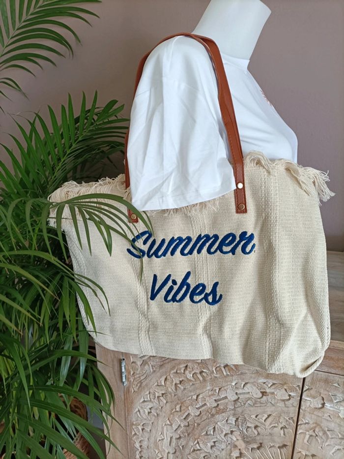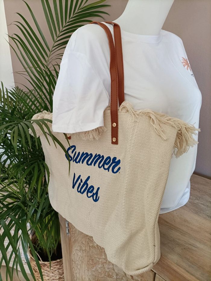 Grand sac à main Fourre-tout en toile beige clair à franges avec broderie bleu roi Summer Vibes ☀️🏝️