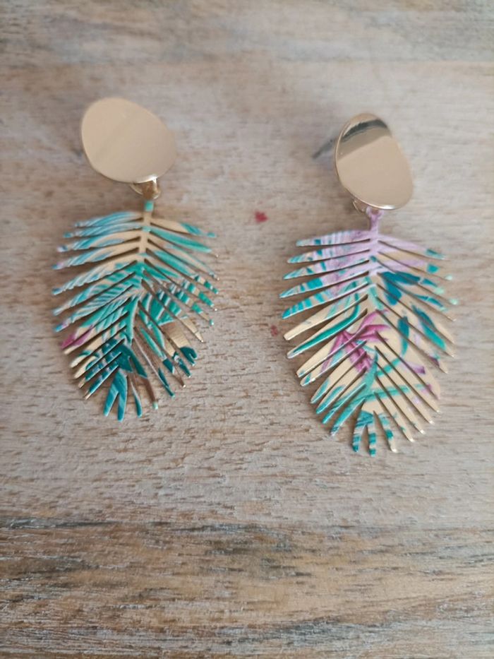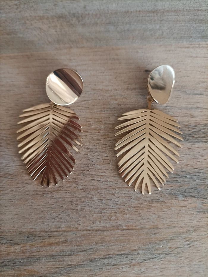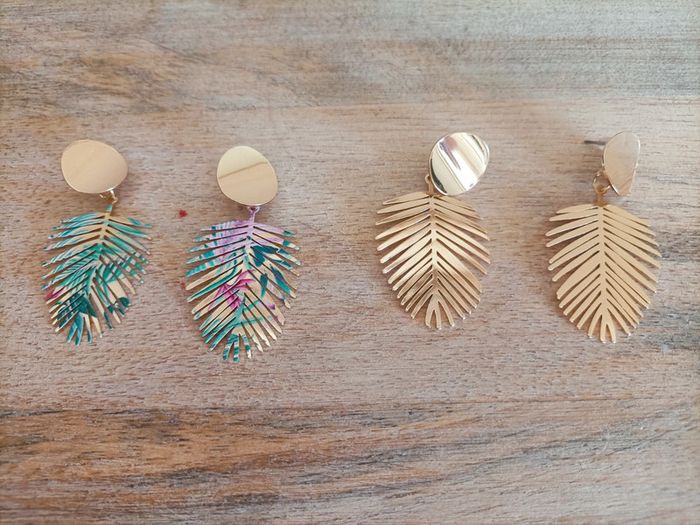 2 paires de boucles d'oreilles pendantes dorées en forme de feuilles tropicales ☀️🏝️ Neuves, jamais portées Emballage soigné et livraison rapide 📦✅ N'hésitez pas à me contacter pour plus d'informations ou d'autres photos 😀