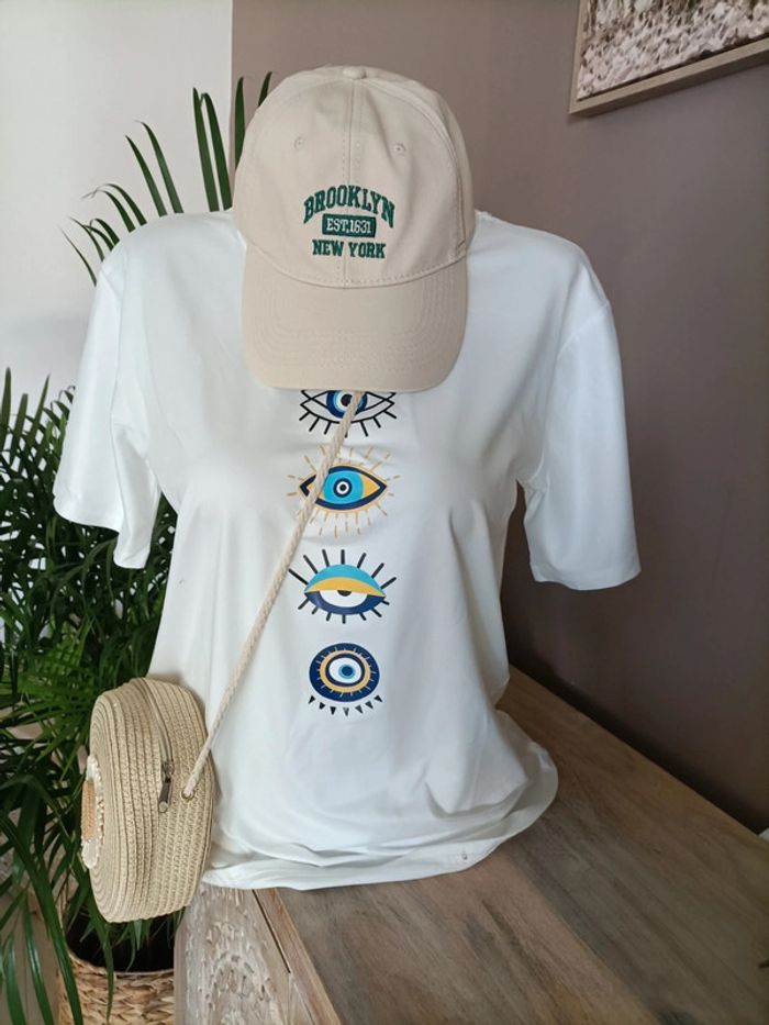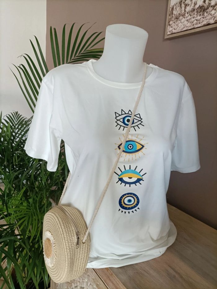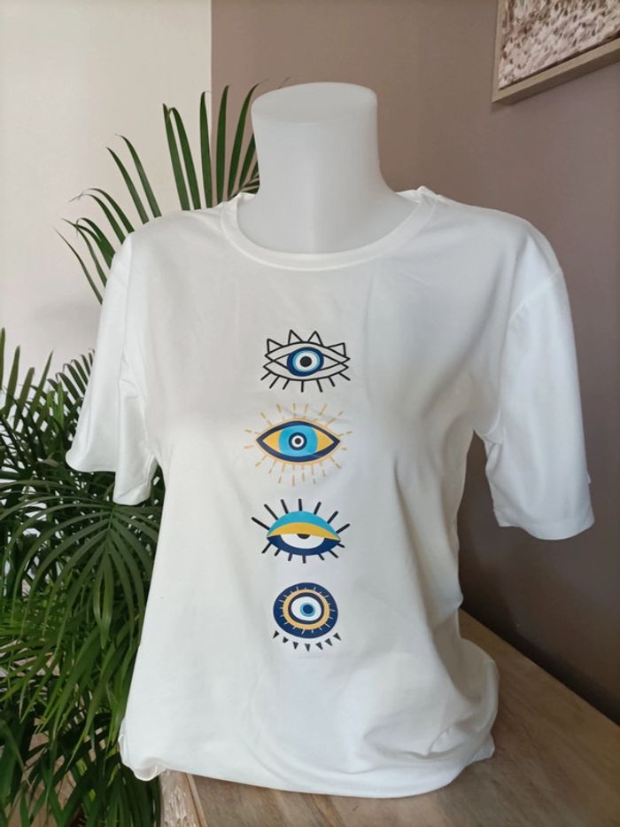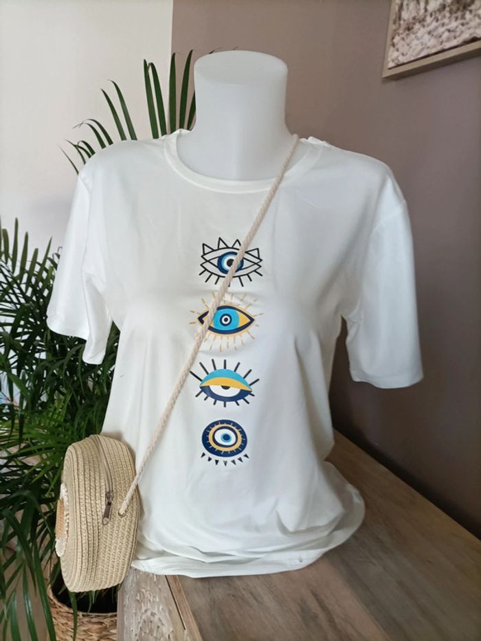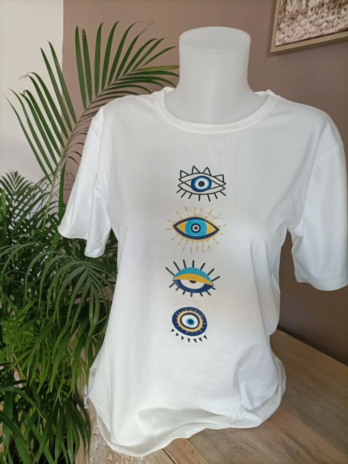 T-shirt blanc avec imprimé Œil du Diable ☀️🩵 Taille M / Neuf, jamais porté Emballage soigné et livraison rapide 📦✅ N'hésitez pas à me contacter pour plus d'informations ou d'autres photos 😀