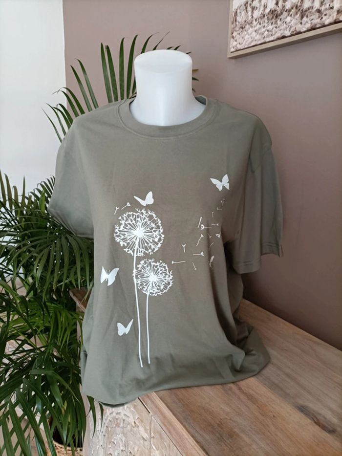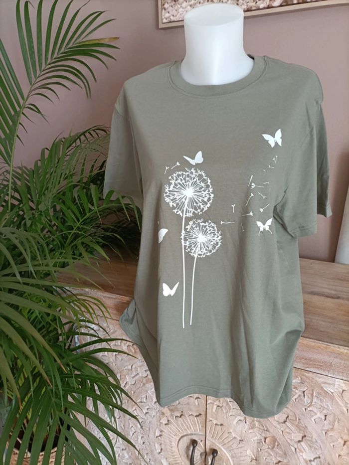 T-shirt vert kaki Papillons Fleurs ☀️🦋 Taille XXL / Neuf, jamais porté Emballage soigné et livraison rapide 📦✅ N'hésitez pas à me contacter pour plus d'informations ou d'autres photos 😀