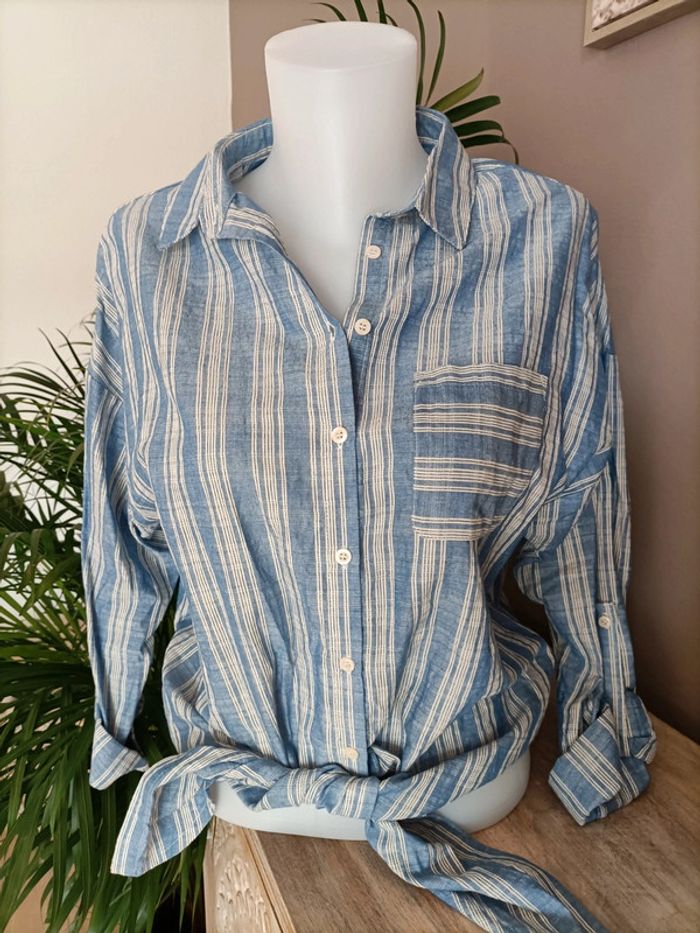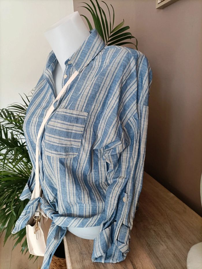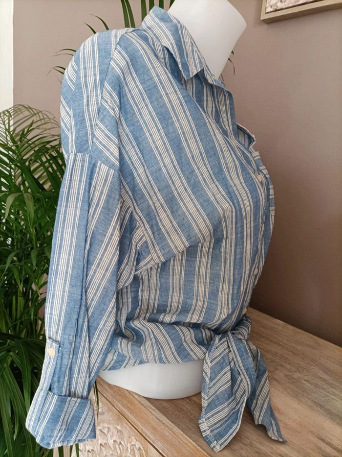 Chemise légère bleue et blanche, à nouer sur le devant, manches longues retroussables avec bouton, matière effet lin ☀️🩵