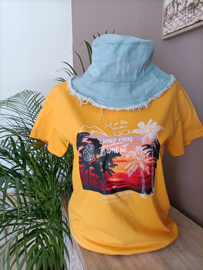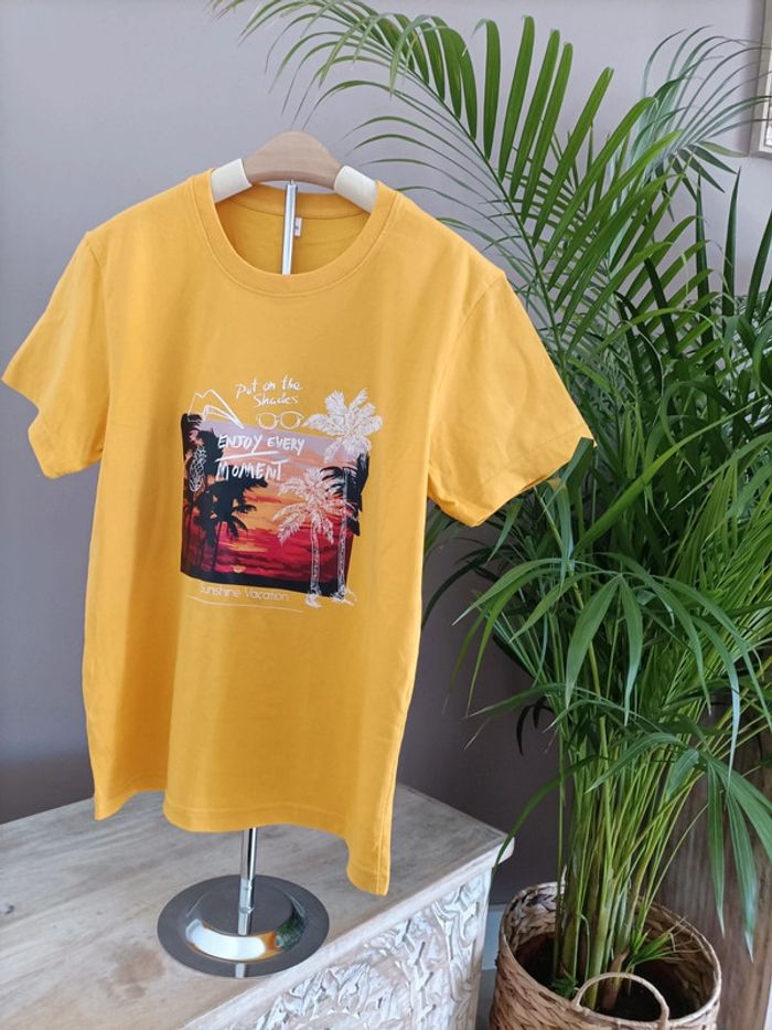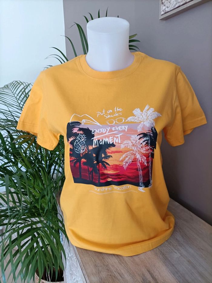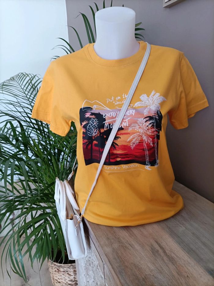 T-shirt jaune avec imprimé Plage Palmiers ☀️🏝️ Taille M / Neuf, jamais porté Emballage soigné et livraison rapide 📦✅ N'hésitez pas à me contacter pour plus d'informations ou d'autres photos 😀