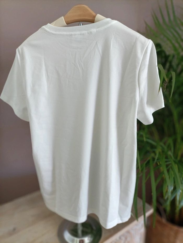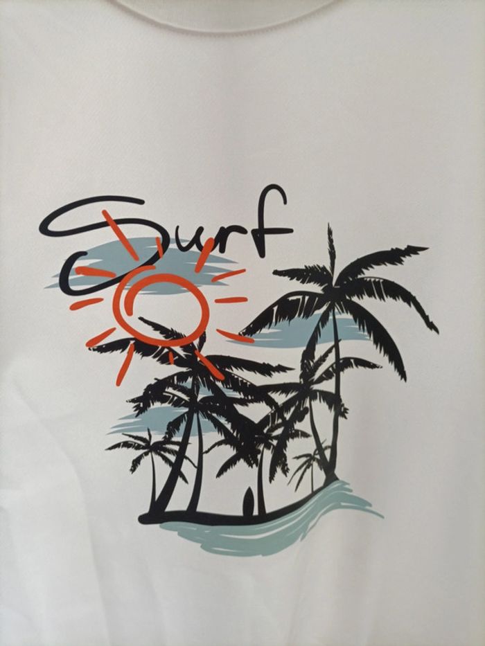 T-shirt blanc (un peu matière maillot) avec imprimé Surf/Palmiers 🏝️🏄 Taille S / Neuf, jamais porté T-shirt propre et repassé lors de l'envoi 🌿 Emballage soigné et livraison rapide 📦✅ N'hésitez pas à me contacter pour plus d'informations ou d'autres photos 😀
