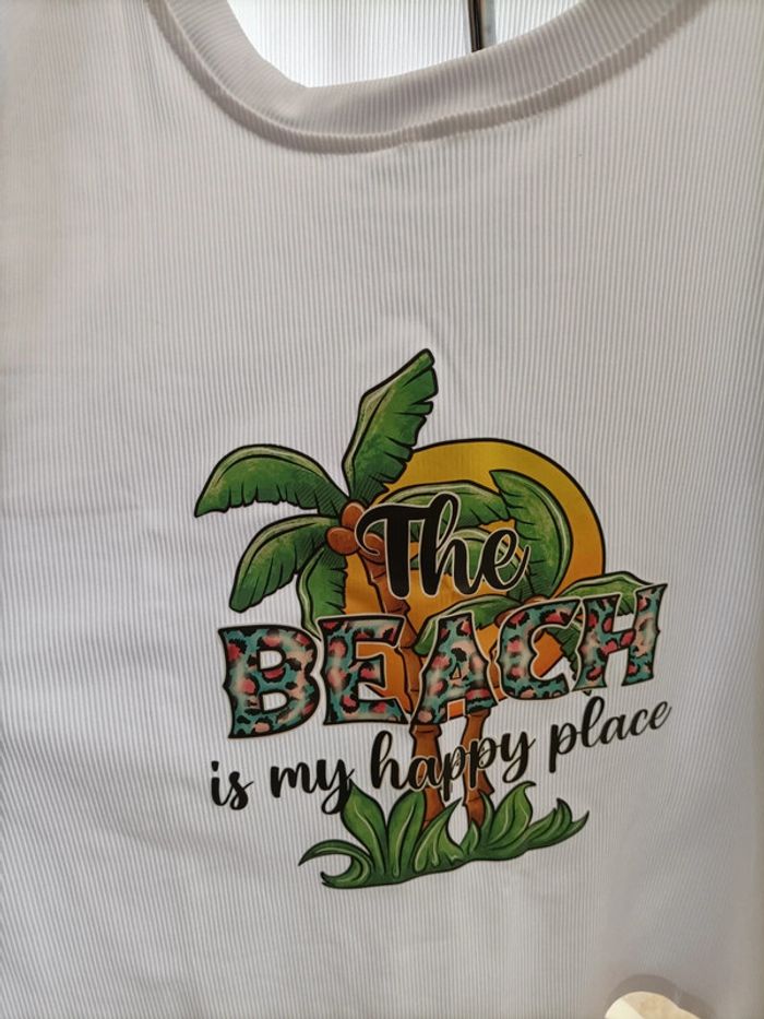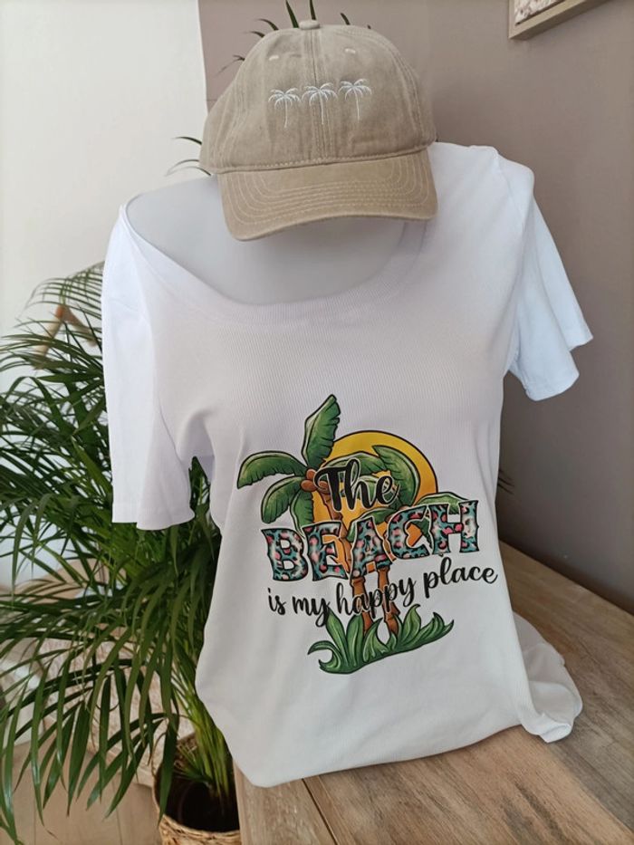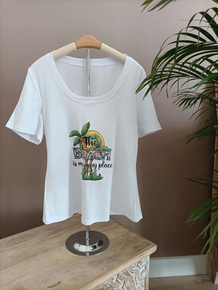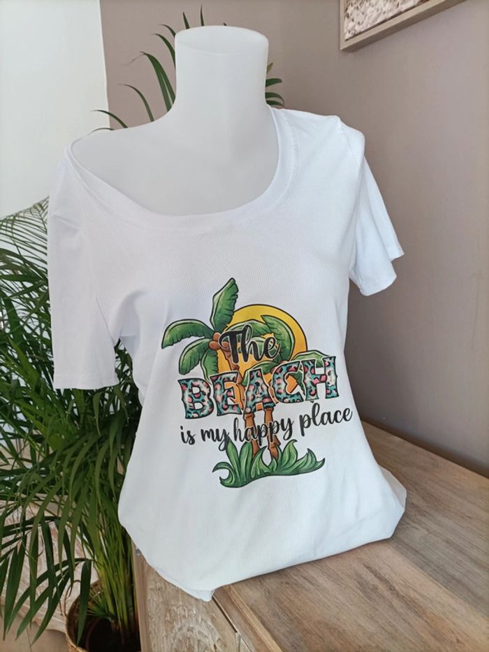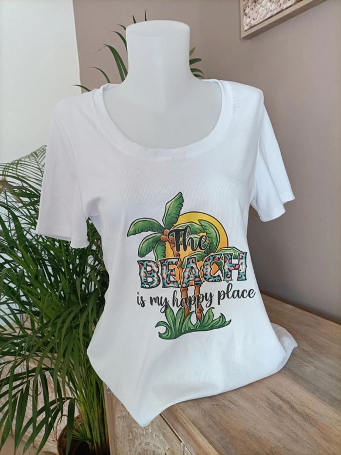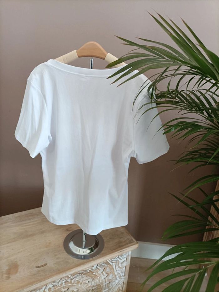 T-shirt blanc côtelé avec léger décolleté imprimé Palmier/Plage ☀️🏝️ Taille L/XL Neuf, jamais porté T-shirt propre et repassé lors de l'envoi 🌿 Emballage soigné et livraison rapide 📦✅ N'hésitez pas à me contacter pour plus d'informations ou d'autres photos 😀