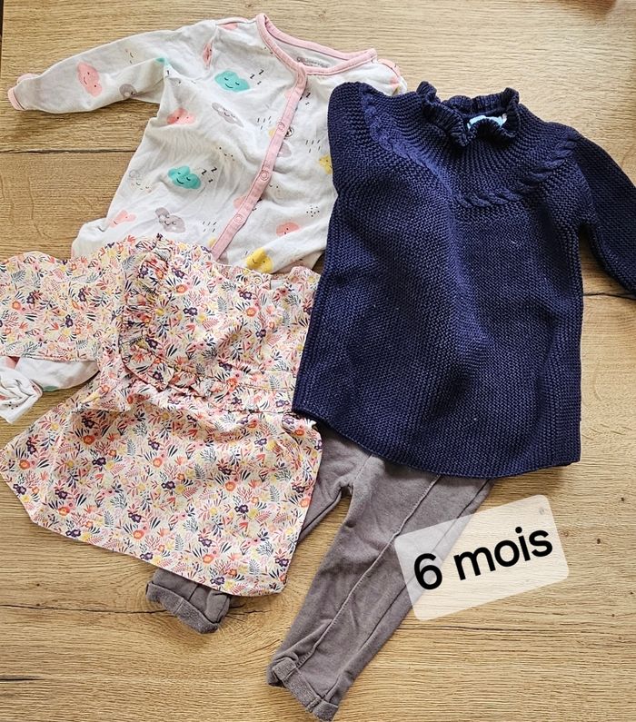 Lot vêtements 6 mois en parfait état comprenant : - 1 robe pull bleue marine Obaibi - 1 legging gris zeeman 1 blouse fleurie tape a l'œil - 1 pyjama 1 pièce nuages Orchestra Tout est En parfait état. D'autres articles filles en cours et à venir dans mon dressing. Nhesitez pas à faire des lots ou me contacter.