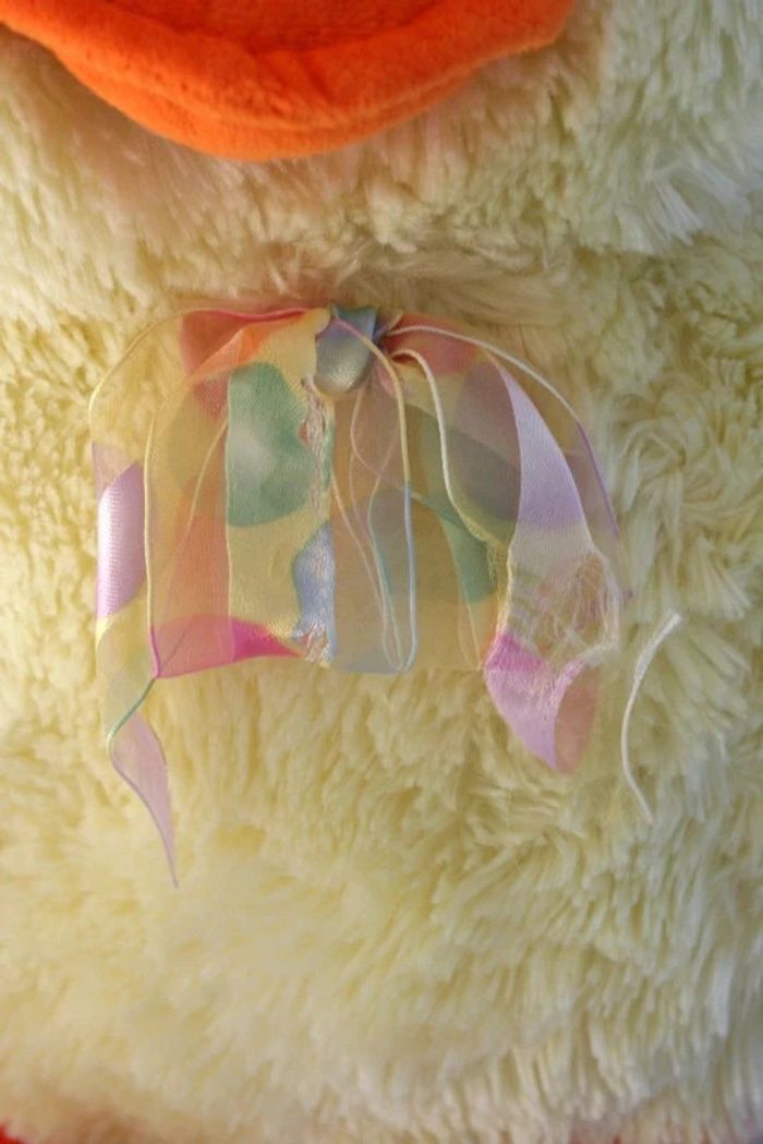 Grande peluche poussin jaune clair, nœud papillon un peu abimé, taille 38x22cm, attention les coutures sont fragiles sur cette peluche, 400g