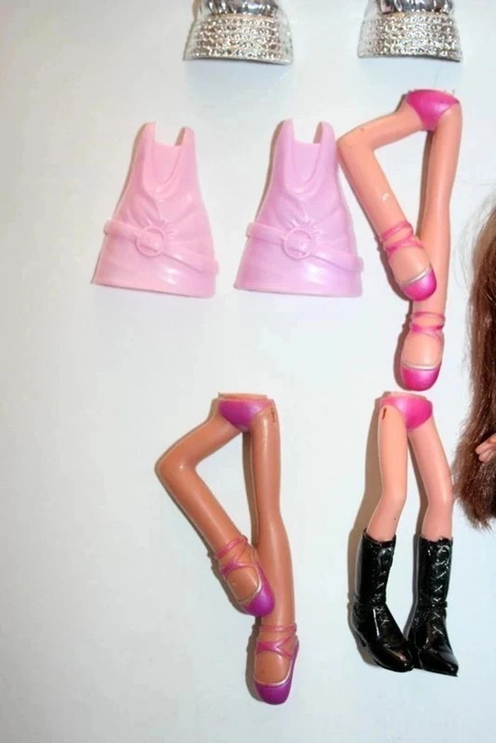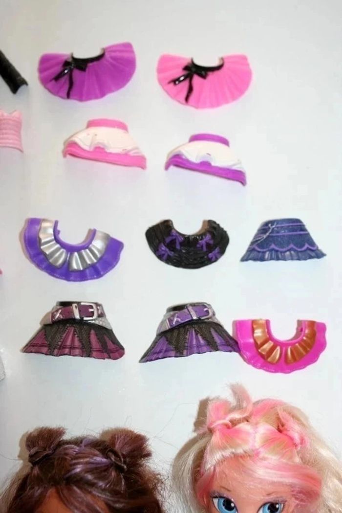 Lot de 2 poupées jambes amovibles, vendu avec 5 paires de jambes + 24 vêtements à clipser, bien utilisées donc il peut y avoir des traces sur les poupées ou l'imprimé des vêtements un peu effacé, 230g