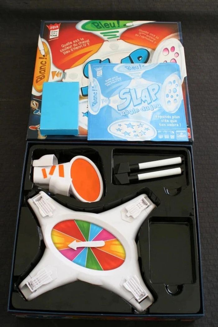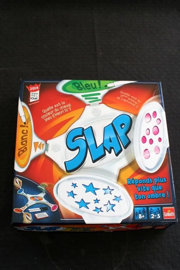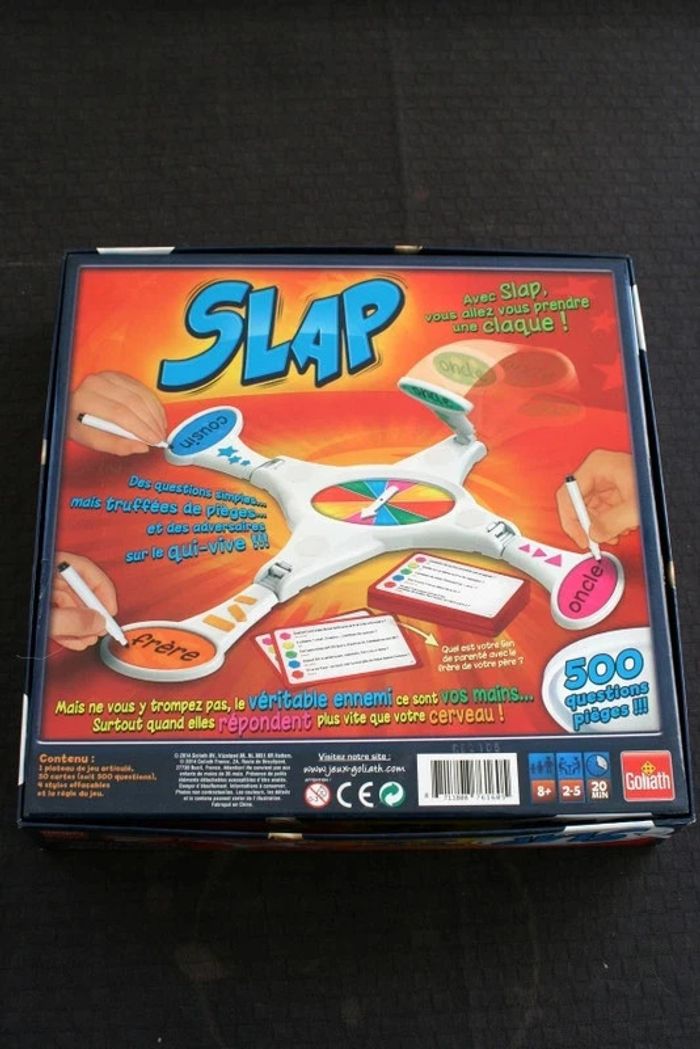 Jeu de société Slap, à partir de 8 ans, de 2 à 5 joueurs, 570g Avec Slap, vous allez vous prendre une claque ! Des questions simples...mais truffées de pièges....et des adversaires sur le qui-vive !!! Mais ne vous y trompez pas, le véritable ennemi ce sont vos mains....surtout quand elles répondent plus vite que votre cerveau ! Contenu : 1 plateau de jeu articulé / 50 cartes soit 500 questions (que 49 présentes) / 4 stylos effaçables (que 2 présents et surement à remplacer mais feutre veleda classique) / règle du jeu