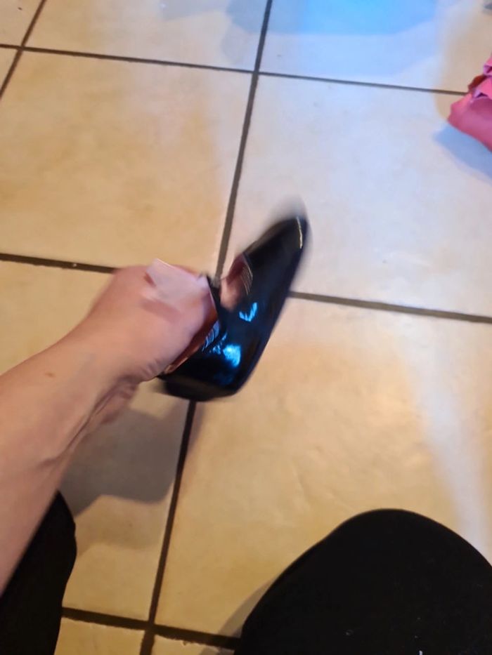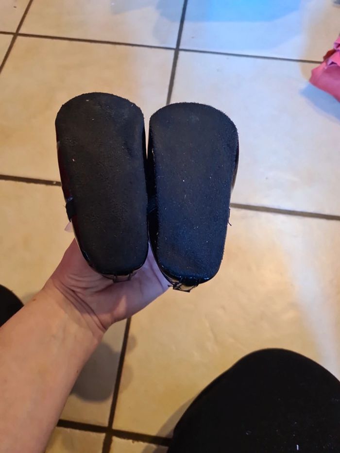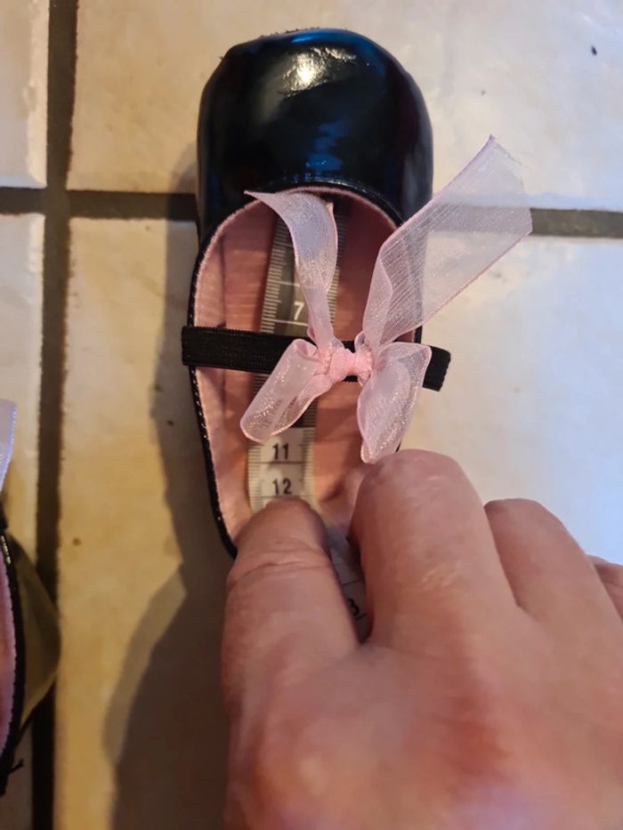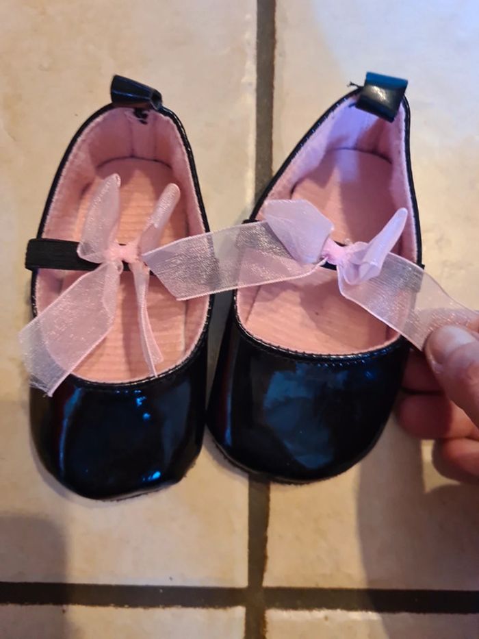 Chaussures style vernis avec semelles roses intérieures vernis Pointure 18/20 Petit flot rose en ruban sur élastiques. Intérieur mesure 12 cm Colis pampers G