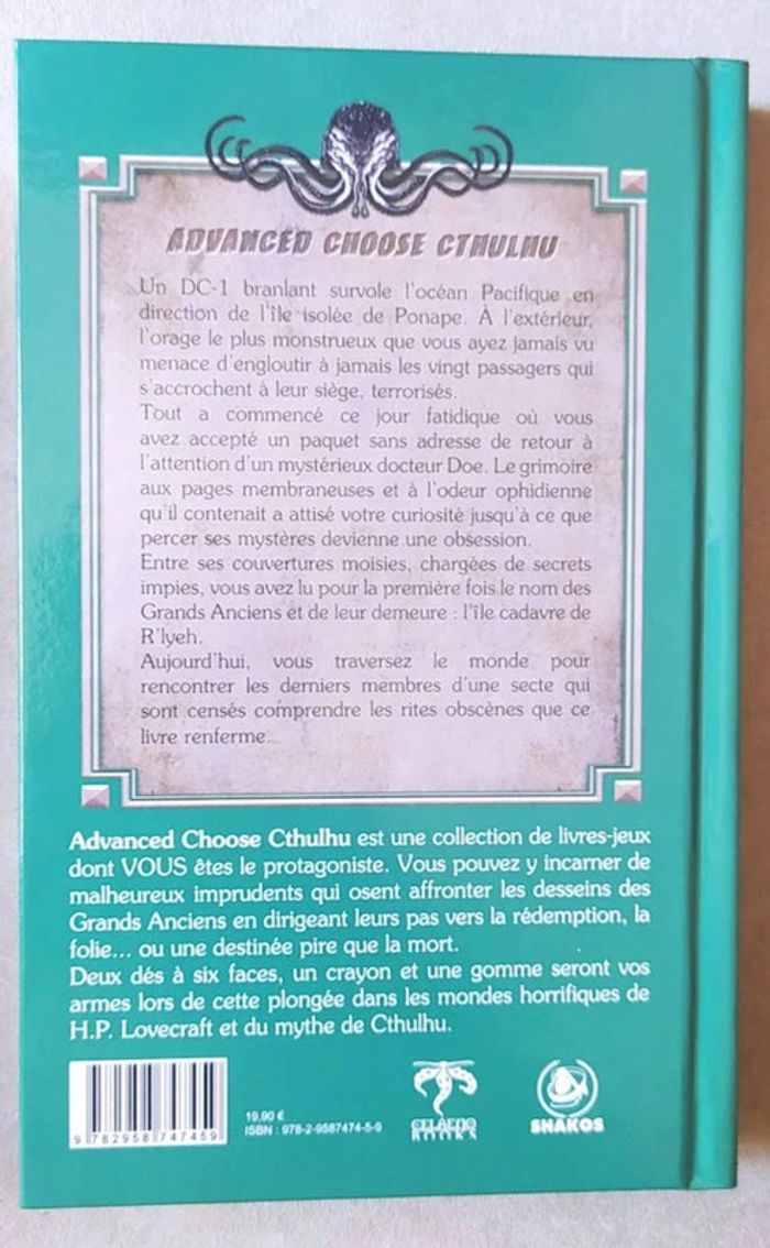 Vente professionnelle - Jeu de société sous emballage - Prix Ferme Le premier tome de la série Advanced Choose Cthulhu, une collection de livres dont VOUS êtes le protagoniste Advanced Choose Cthulhu est une collection de livres de jeux dont VOUS êtes le protagoniste. Créez votre personnage et contrecarrez les desseins des Grands Anciens et de leurs serviteurs, à moins que vous ne sombriez dans la folie… ou que vous trépassiez dans d’atroces souffrances. Deux dés, un crayon et une gomme seront vos seules armes pour ce périple à travers les mondes du mythe de Cthulhu de H.P. Lovecraft. Découvrez le premier tome de cette série et affrontez les dangers innommables de l’île de R’lyeh à travers plus de 460 paragraphes jouables. Un DC-1 branlant survole l'océan Pacifique en direction de l'île isolée de Ponape. À l'extérieur, l'orage le plus monstrueux que vous ayez jamais vu menace de vous engloutir à jamais, vous et les vingt autres passagers qui s'accrochent à leur siège, terrorisés. Tout a commencé le jour fatidique où vous avez récupéré un paquet adressé à un mystérieux Docteur Doe et abandonné devant votre porte. Le grimoire aux pages membraneuses et à l'odeur ophidienne qu'il contenait a attisé votre curiosité. Percer ses mystères est alors devenu une véritable obsession... Entre ses pages moisies, chargées de secrets impies, vous avez découvert pour la première fois le nom des Grands Anciens et de leur funeste demeure : l'île maudite de R'lyeh. Aujourd'hui, vous traversez le monde à bord de cet avion en espérant rencontrer les derniers membres d'une secte capables de comprendre les rites obscènes qu'il contient. Ludipresta