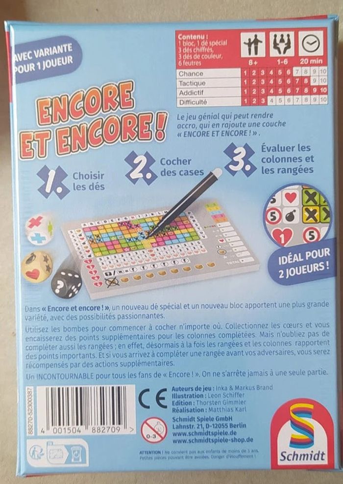 Vente professionnelle - Jeu de société sous emballage - Prix Ferme Français à partir de 8 ans moins de 30mn 1 à 6 joueur(s) Le retour du Roll & Write à succès Après le succès de Encore !, les auteurs reviennent avec un nouveau Roll & Write, Encore et Encore ! Dans ce nouvel opus de la gamme, les joueurs devront tenter de cocher le plus rapidement possible un maximum de cases (colonnes, lignes ou cases de la même couleur) de manière à créer des suites. Pour cela, vous devrez combiner un dé de couleur et un dé chiffré. Pour pourrez alors cocher toutes les cases attenantes de la couleur choisie. Réfléchissez bien et piquez les meilleures combinaisons au nez et à la barbe de vos adversaires. Un jeu frénétique à jouer Encore et encore ! Dans Encore et Encore !, un nouveau dé spécial et un nouveau bloc apportent une plus grande variété de possibilités passionnantes. Utilisez les bombes pour commencer à cocher n'importe où Collectionnez les cœurs et encaissez des points supplémentaires pour les colonnes complétées N'oubliez pas de compléter aussi les rangées. En effet, désormais à la fois les rangées et les colonnes rapportent des points importants. Et si vous arrivez à compléter une rangée avant vos adversaires, vous serez récompensés par des actions supplémentaires. Le jeu s’achève dès qu’un joueur a complété deux couleurs. Un incontournable pour tous les fans de Encore !. On ne s'arrête jamais à une seule partie. Vidéo : https://www.youtube.com/watch?v=O6oyNgbBwTs Ludipresta