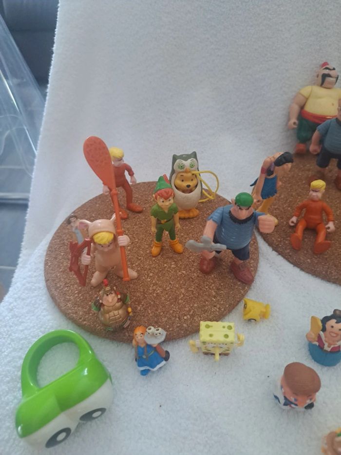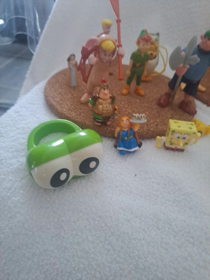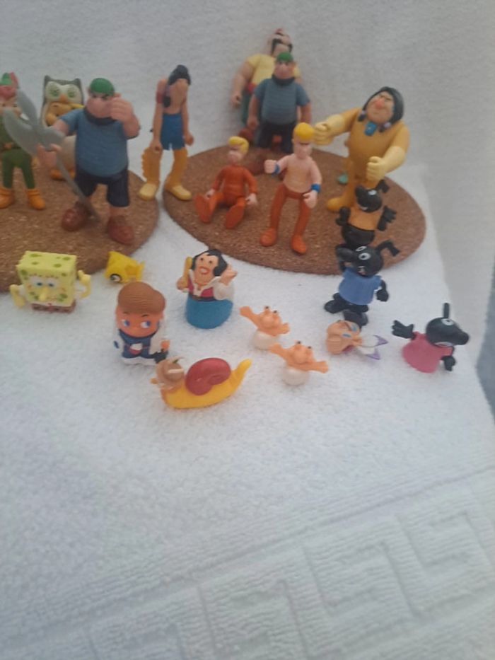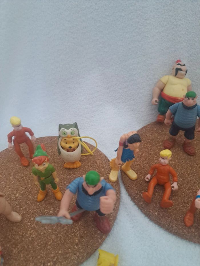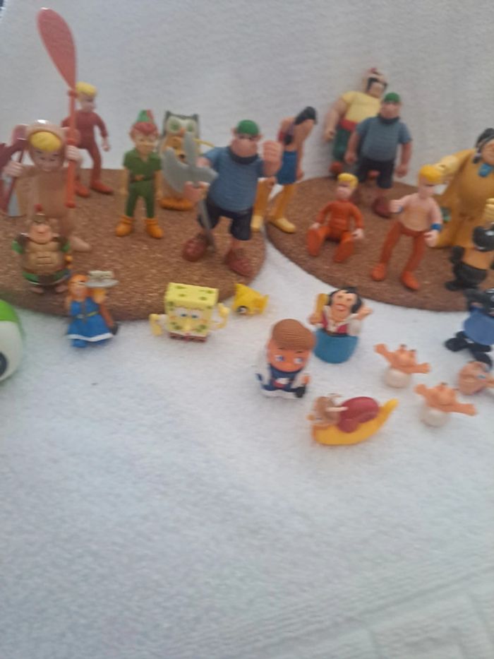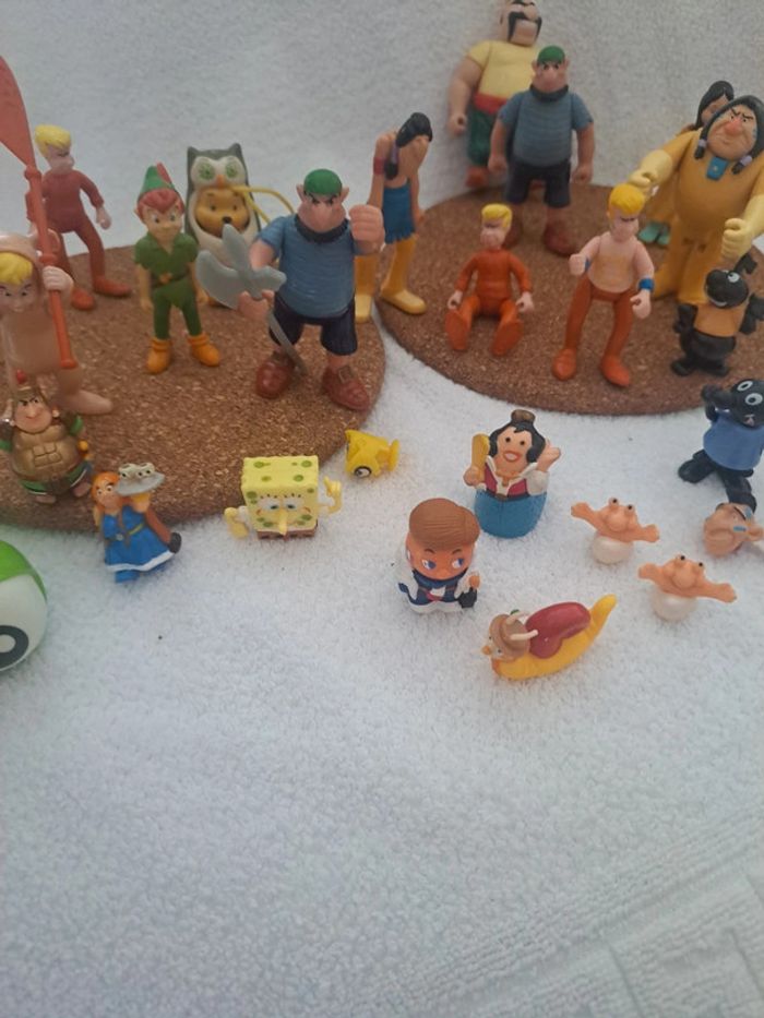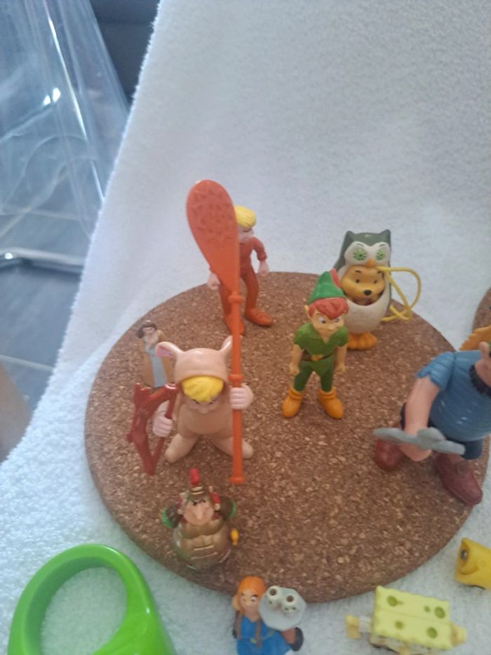 Lot de 26 figurines Peter Pan Asterix Bob l'éponge Les notes de musique Le manège enchanté Winnie L'ourson