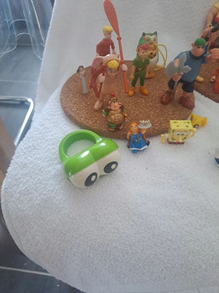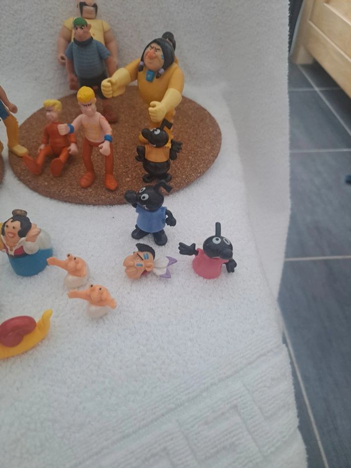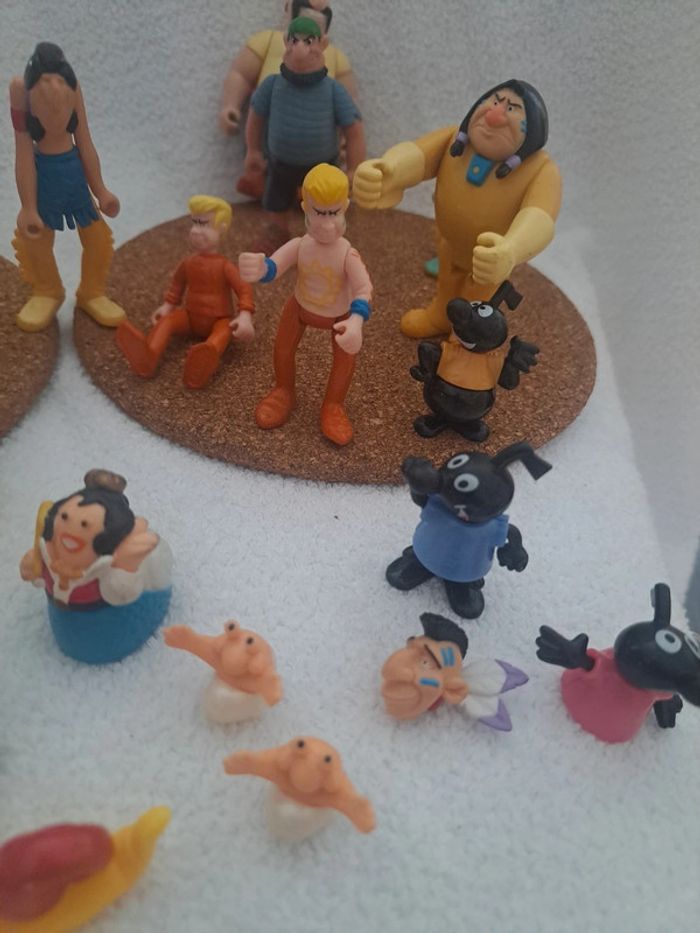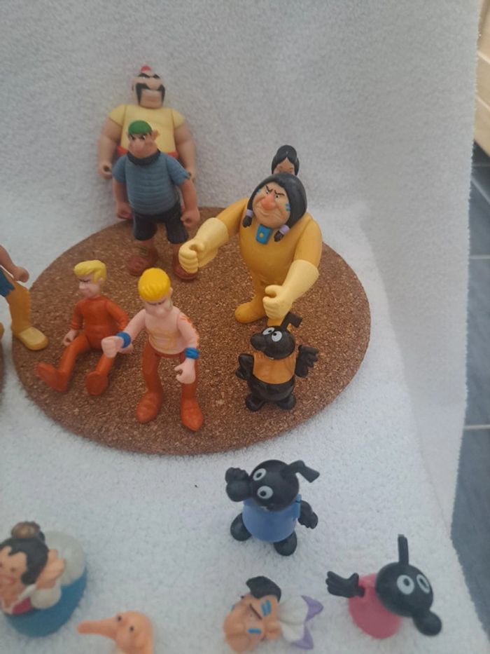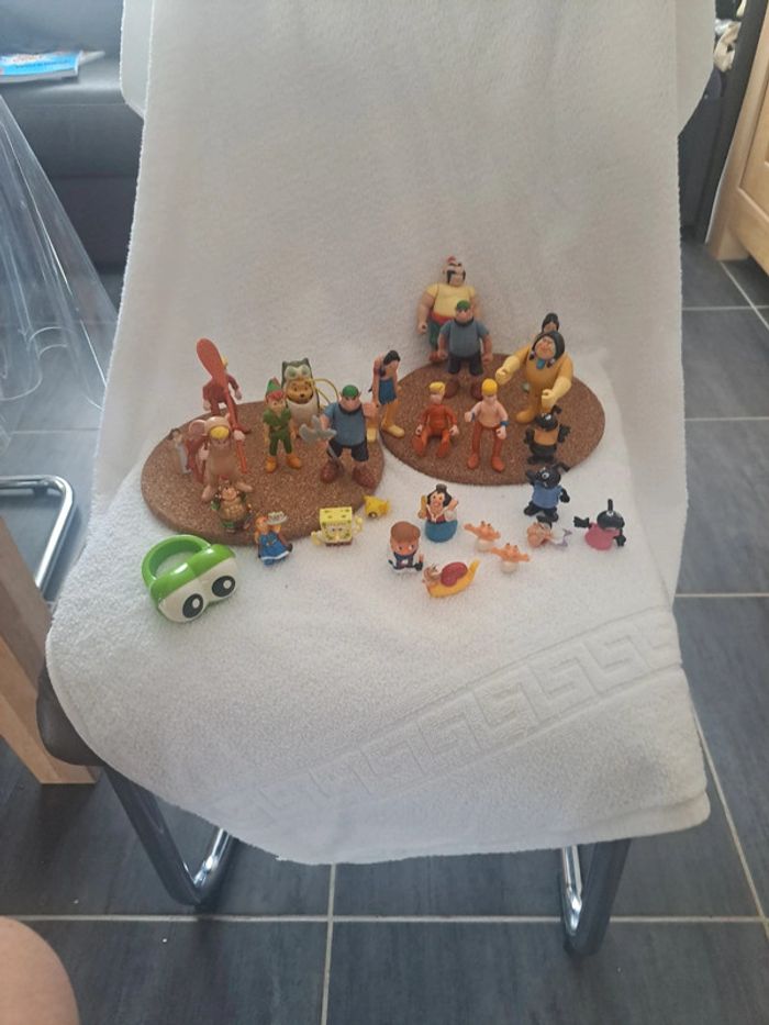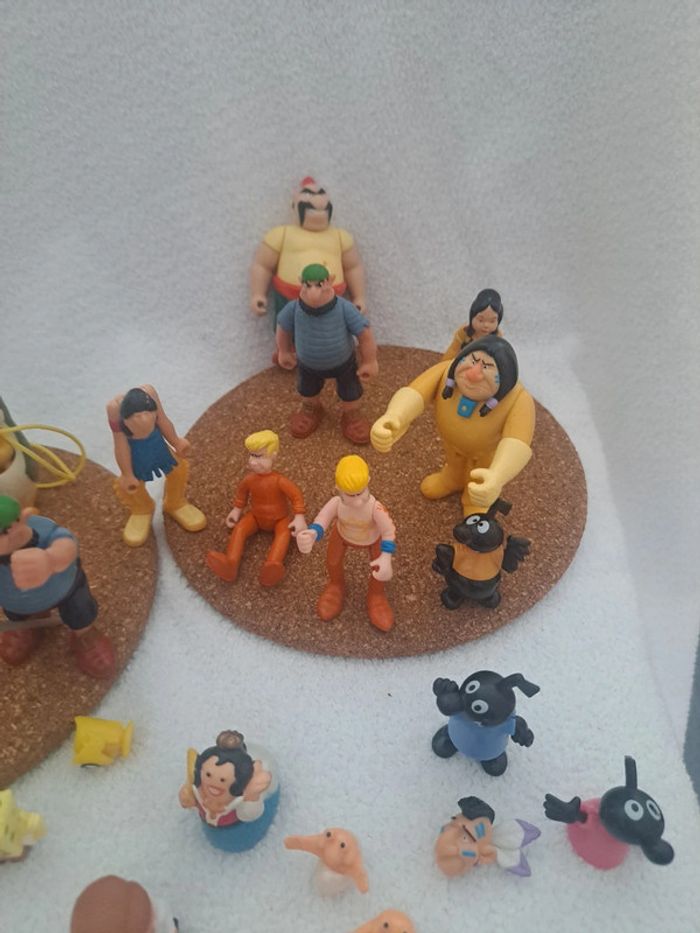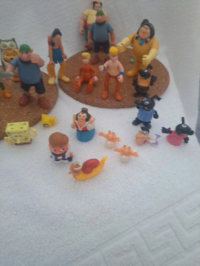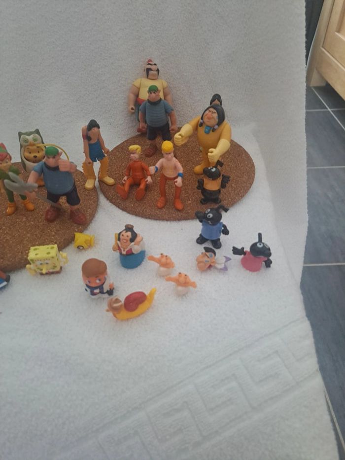 Lot de 26 figurines Peter Pan Asterix Bob l'éponge Les notes de musique Le manège enchanté Winnie L'ourson