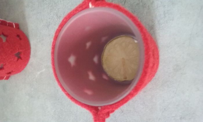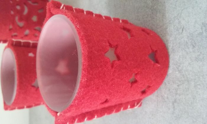 Petits verres de 7cm recouverts de feutrine rouge, vendus avec leur bougie chauffe-plat.