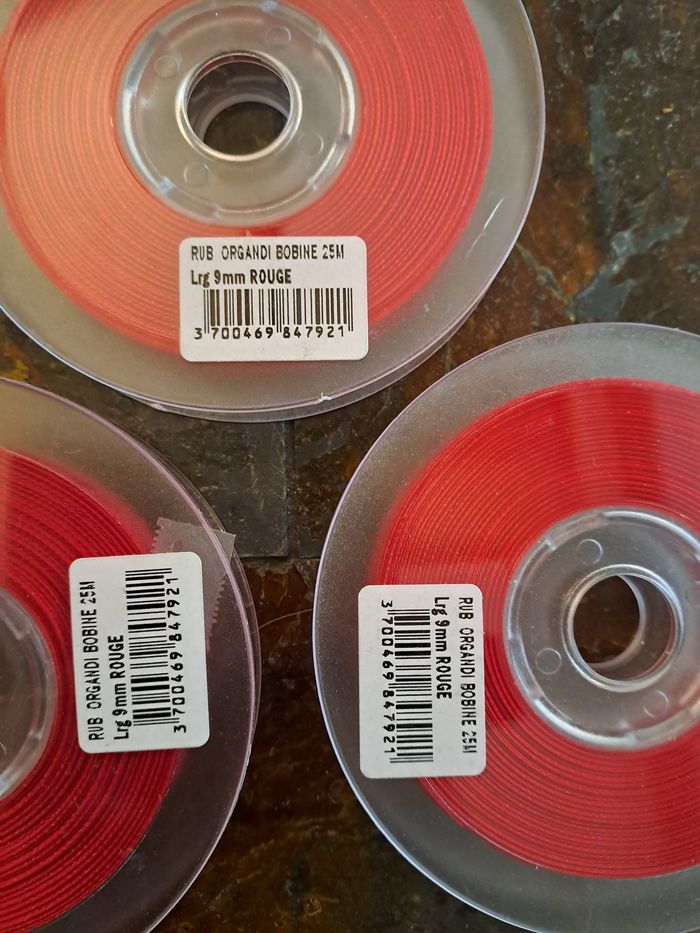Lot de 3 bobines de ruban organza rouge. Largeur 9 mm, Longueur 25 m. Neuf, jamais utilisé. Juste une déroulé pour prendre la photo.