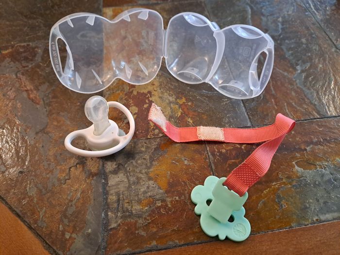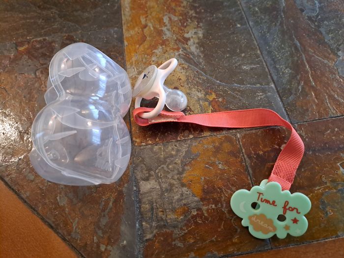 Attache tétine. Je vend unique l'attache tétine. La tétine n'étant pas neuve, je ne la vend pas mais je vous la laisse avec au cas où ça vous dépannerez. A priori, après stérilisation il n'y a pas de problème. Et je vous laisse également la boîte qui peut vous servir de rangement ou pour la stérilisation il me semble.