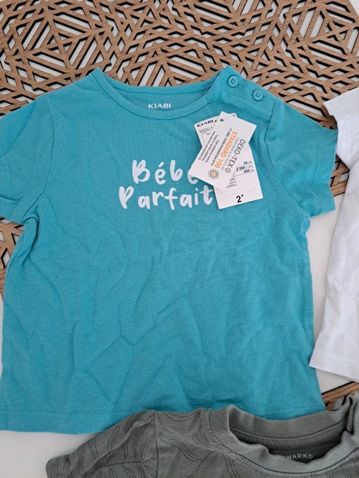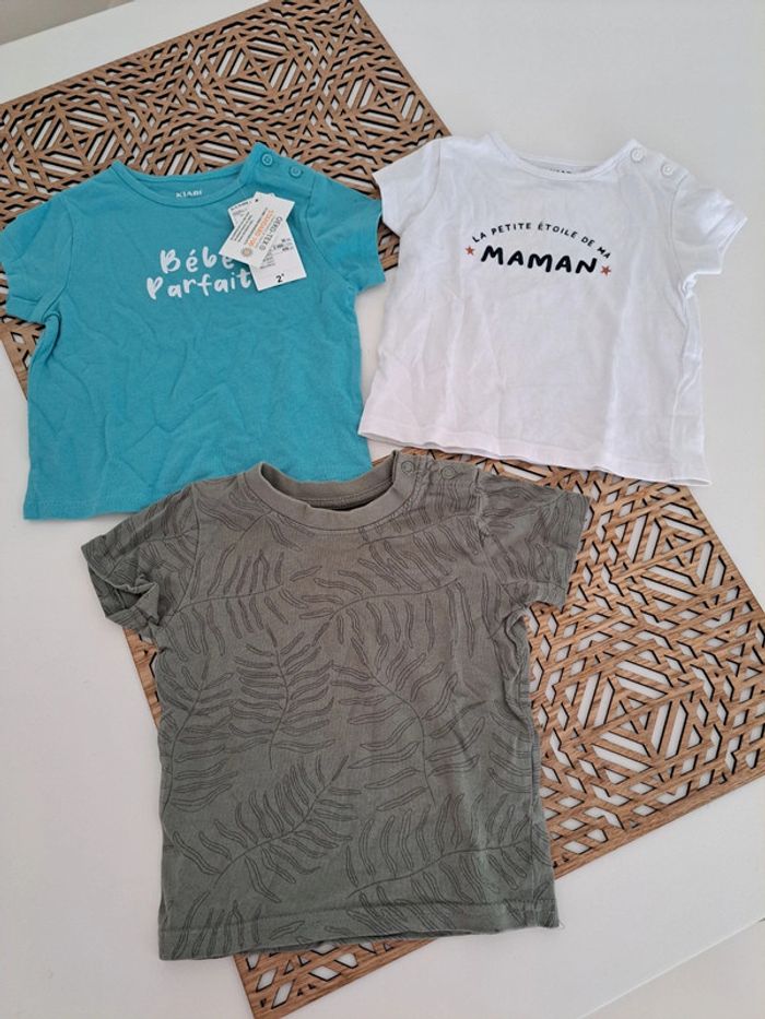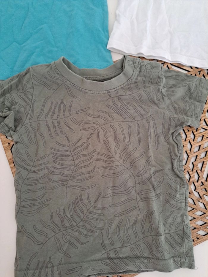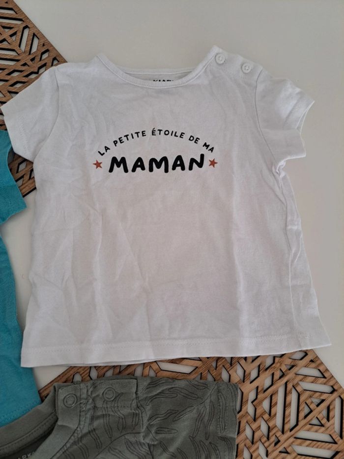 Lot de 3 Tee-shirts Le bleu bleu kiabi 6 mois neuf avec étiquette Le blanc kiabi 6 mois neuf sans étiquette Le vert primark 6/9 mois Très bon état