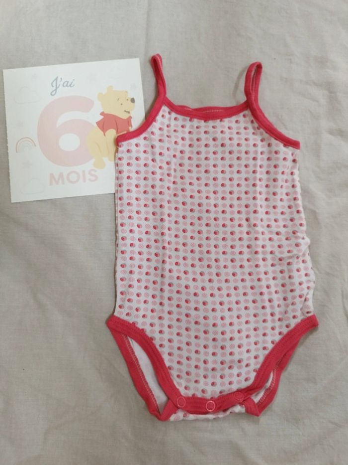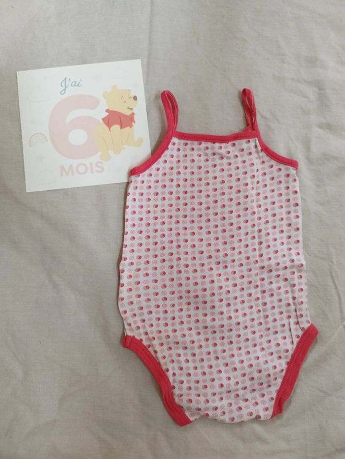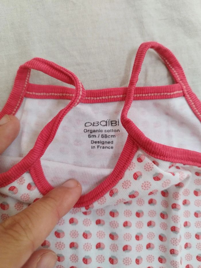Body bretelles avec petites fraises idéal pour l'été et les fortes chaleurs . Taille 6 mois - 68 cm de la marque Obaibi. Taille plutôt petit (entre 3 et 6 mois)