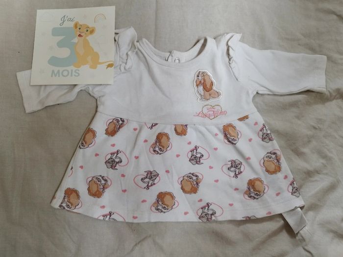Robe pour 1 mois / tunique pour 3 mois la Belle et le Clochard. Déjà portée mais en très bon état. Achetée à Primark. 62cm