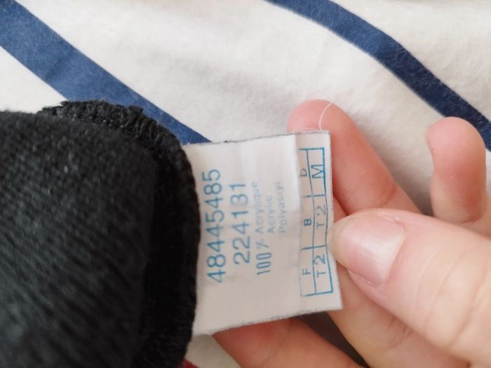 Bonjour Je vends un pull rayé noir blanc et Bordeaux déjà porté. Marqué taille 2, je dirais 36-38 . Bouloche un peu