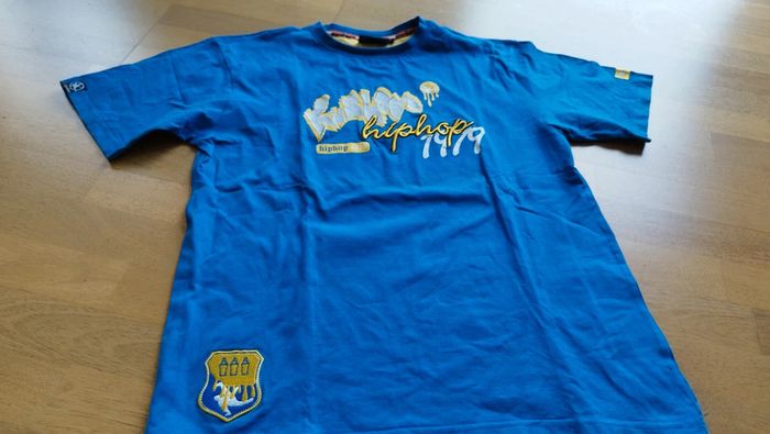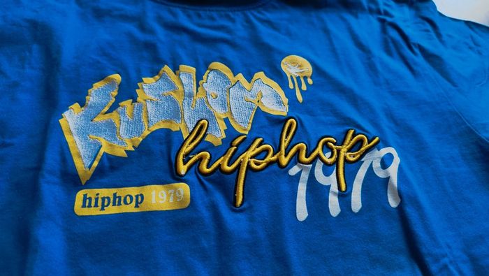 Très beau tee shirt vintage, belle qualité et épais. Kuslom hiphop 1979 Couleur bleu et jaune idem photo Dos uni Taille L Neuf