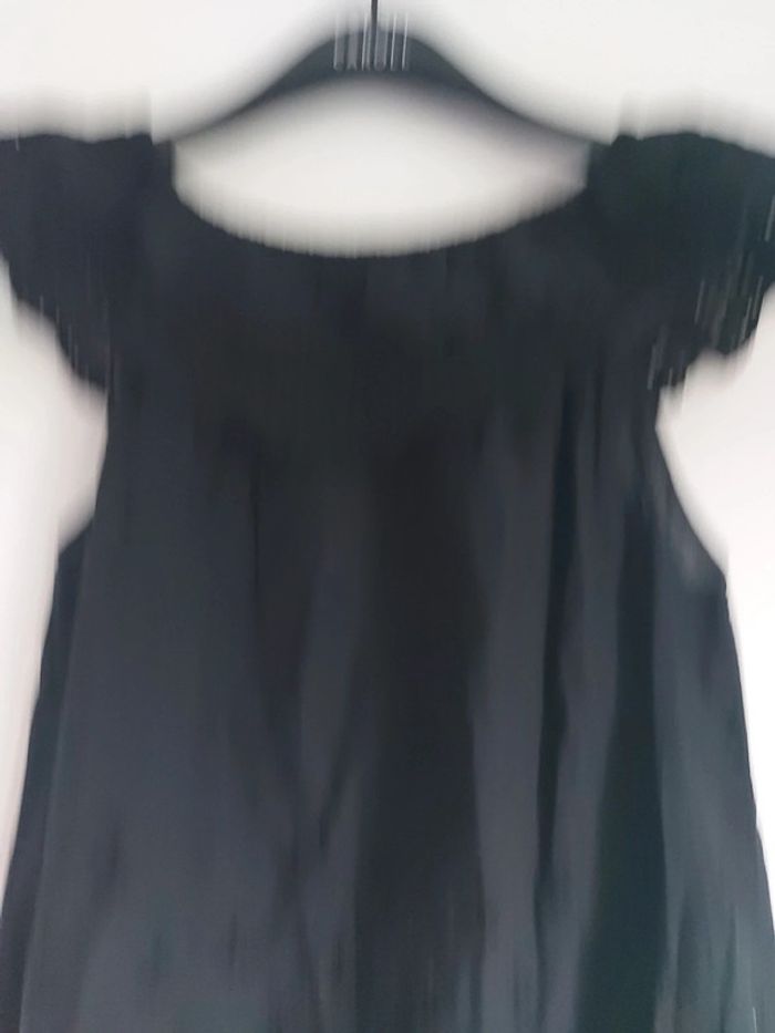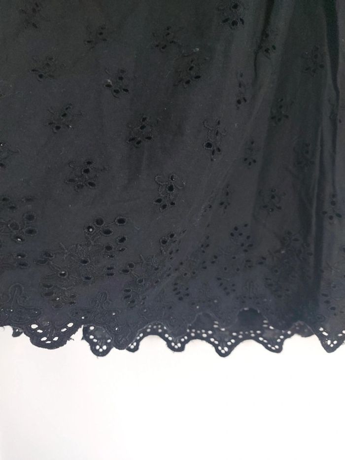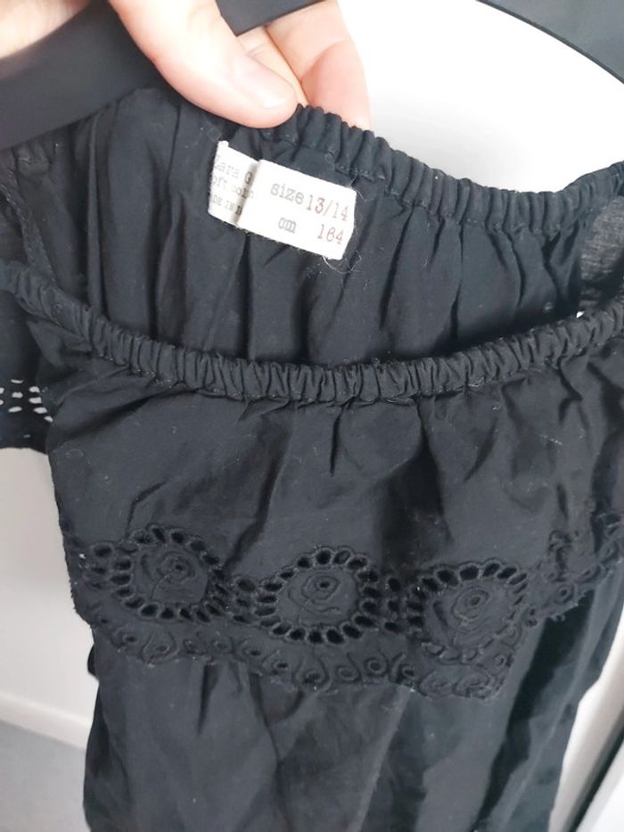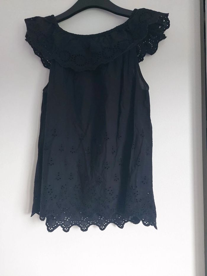Top, blouse Zara noir en broderie anglaise, le volant peut se porter sur les épaules ou remonté. Tbe.